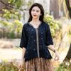 Хлопок Льняная вышитая рубашка Женская летняя рубашка-пуловер Ретро футболка Свободный топ с V-образным вырезом Блузки Рубашки