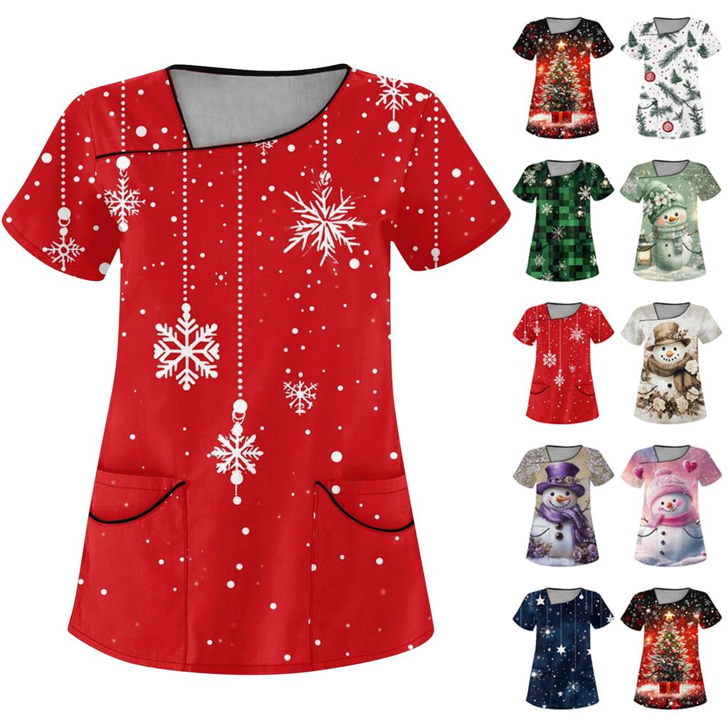 Женская рабочая одежда с рождественским принтом, покатый воротник и двухслойные карманы, базовый пуловер сверху