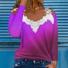 Модный кружевной пуловер с V-образным вырезом, длинный рукав, градиентный принт, повседневная футболка