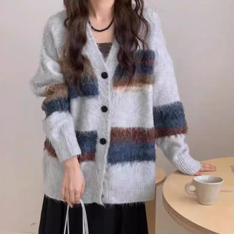 Полосатый вязаный свободный кардиган женский Harajuku Chic винтажные свитера универсальная осенне-зимняя трикотажная одежда с V-образным вырезом в корейском стиле — купить товар онлайн с бесплатной доставкой по всему миру!