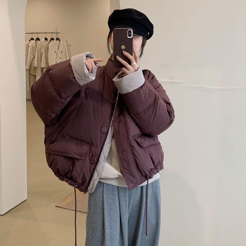 Контрастный цвет маленький 90 белый утиный пуховик женский короткий 2024 зима модный дизайн чувство утолщенный воротник стойка куртка хлеб — купить товар онлайн с бесплатной доставкой до всему миру!