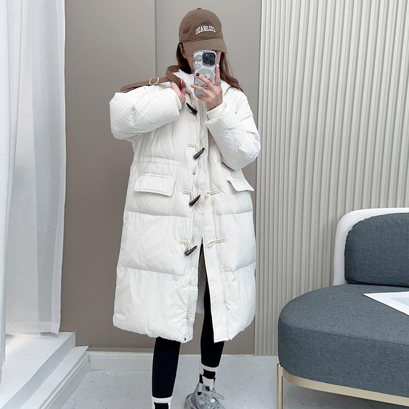 Gentle horn buckle down jacket women's long 2024 winter new Pinghu thickened small person over the knee warm jacket