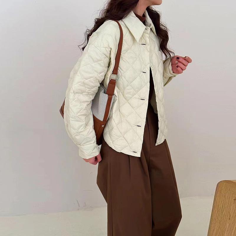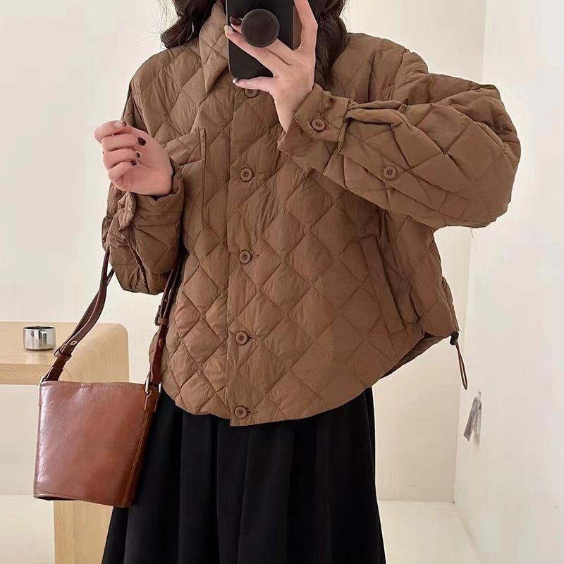 Куртка-пуховик с воротником-рубашкой женская короткая 2024 зимняя легкая роскошная модная теплая тонкая белая куртка-ромб из утиного пуха прилив
