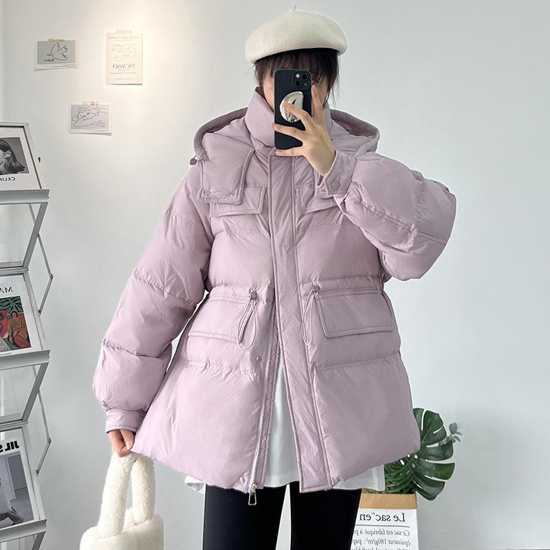 Hooded white duck down jacket women's 2024 winter new Dongmen waist tooling warm small jacket tide