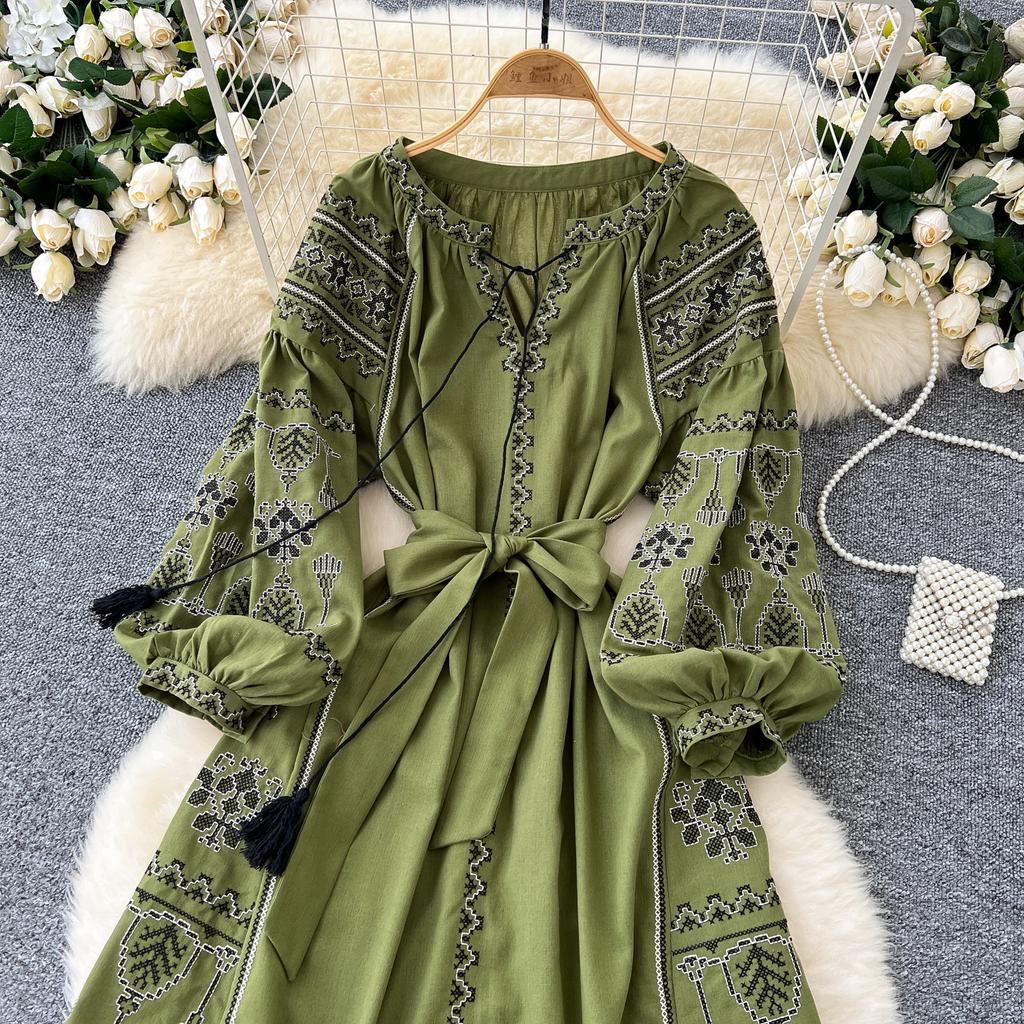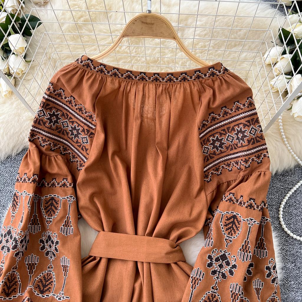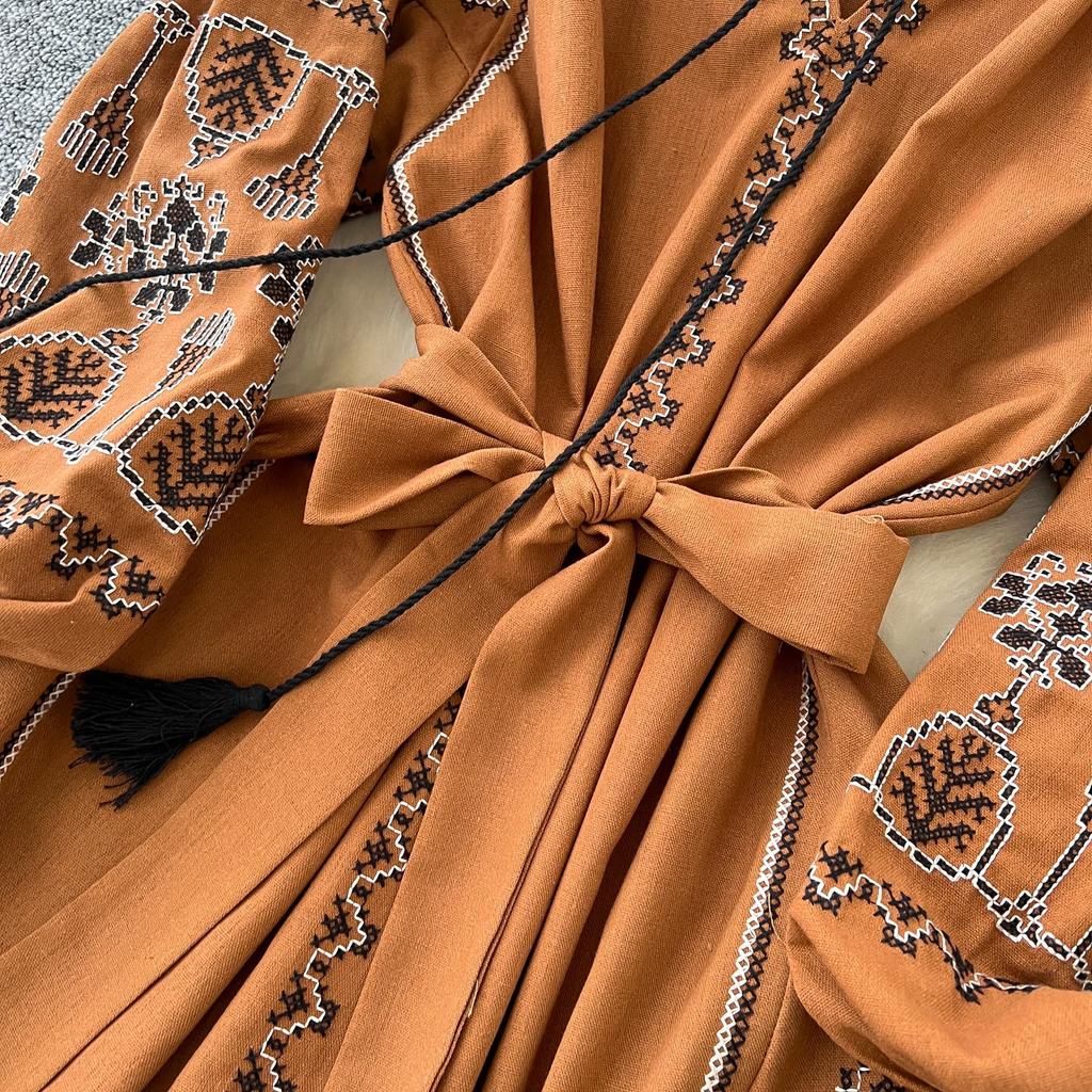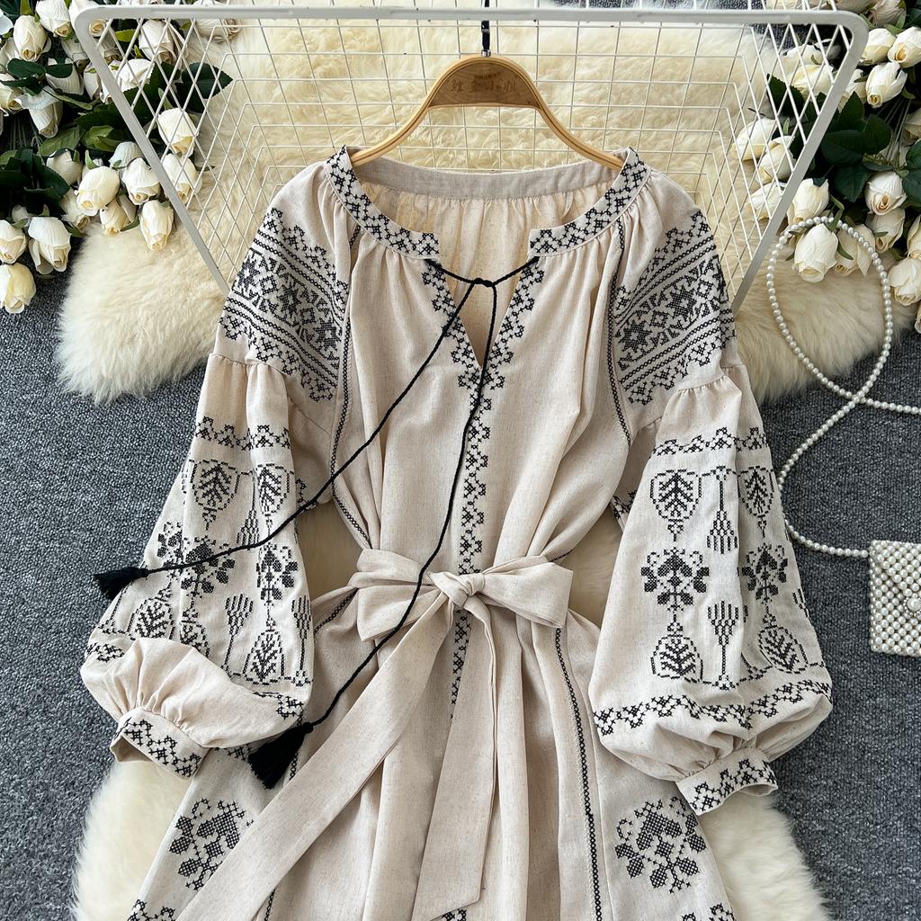 Элегантный V-образный вырез, длинный рукав-фонарик, шикарные вышитые свободные повязки в стиле бохо, французские каникулы, уличная осенняя одежда