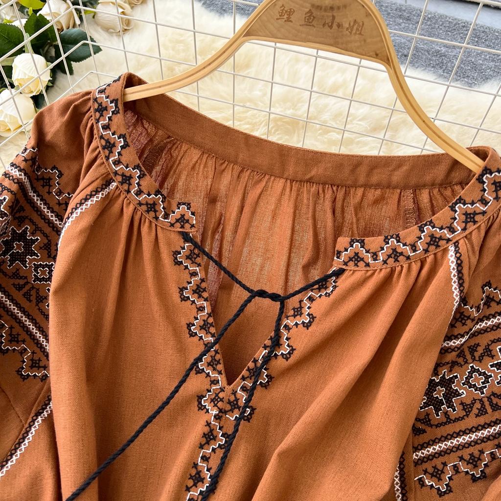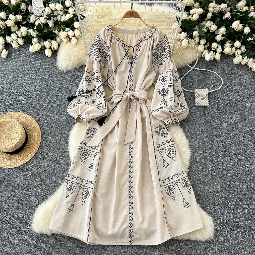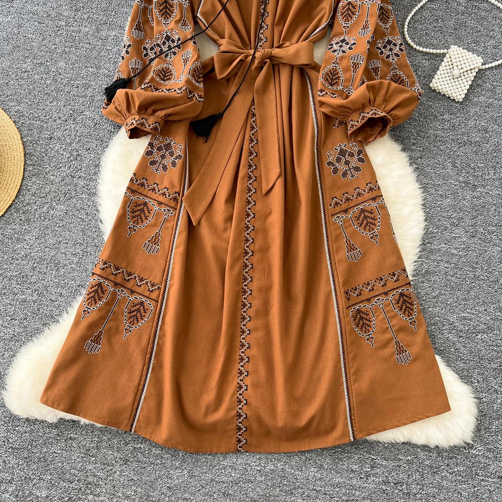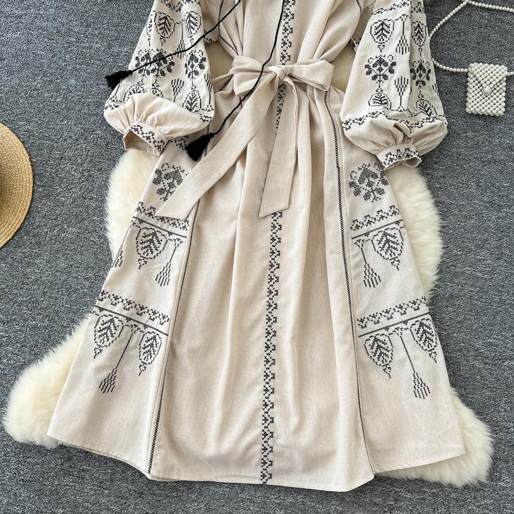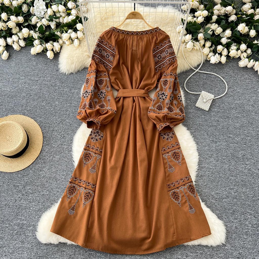 Элегантный V-образный вырез, длинный рукав-фонарик, шикарные вышитые свободные повязки в стиле бохо, французские каникулы, уличная осенняя одежда