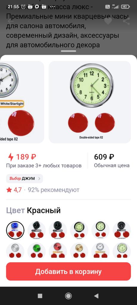 Красивые часы на приборную панель! Идут, проверяю на точность. Боялась, что придут не того цвета, так как была путаница: на фото синие, а в обозначении значились как красные! Но всё как было на фото продавца! Благодарю Джум!