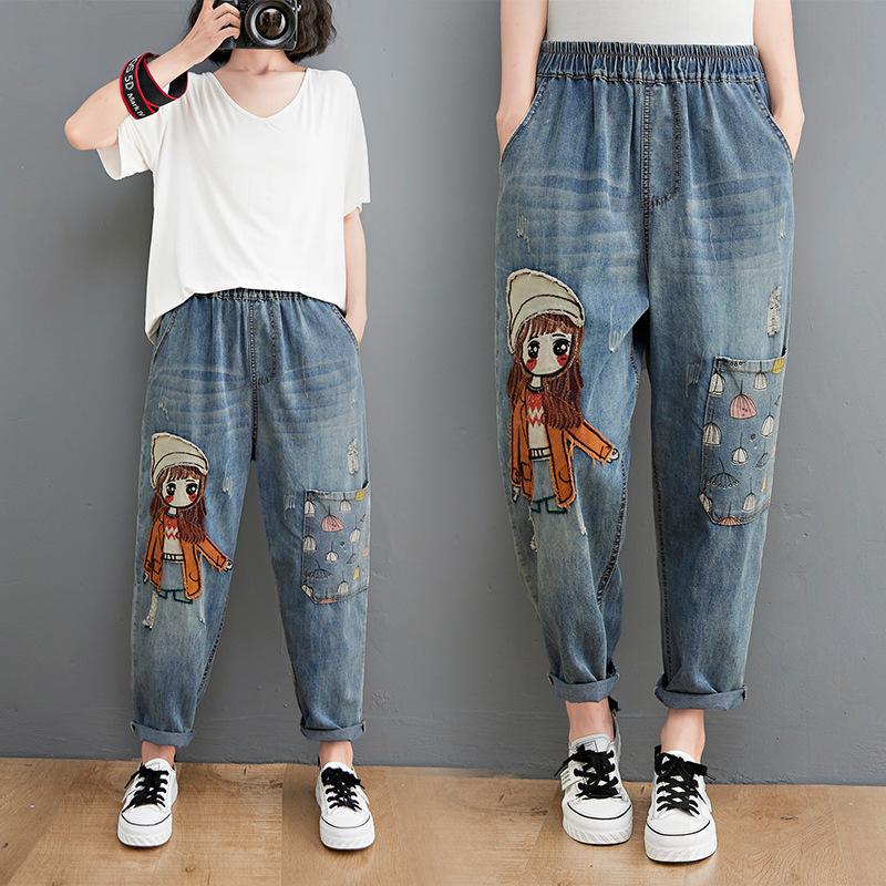 Осень-весна, мультяшные вышитые джинсы для девочек, женские повседневные бриджи с высокой талией и карманами, синие джинсы-шаровары для мам