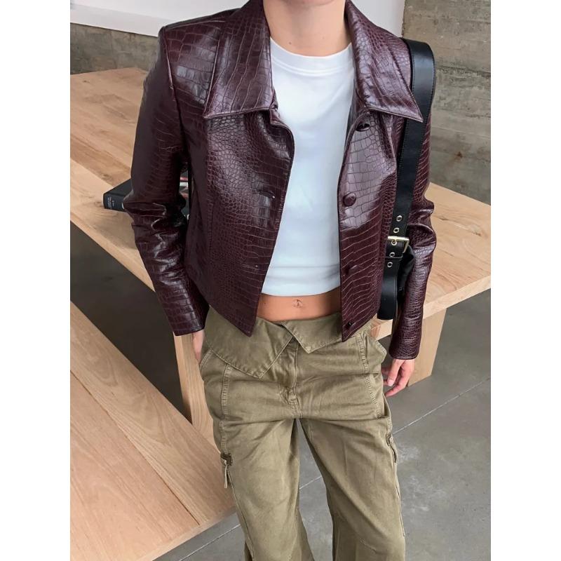 Короткое женское кожаное пальто бордового цвета с лацканами и эффектом крокодиловой кожи, куртка High Street на пуговицах, новая осенняя женская верхняя одежда