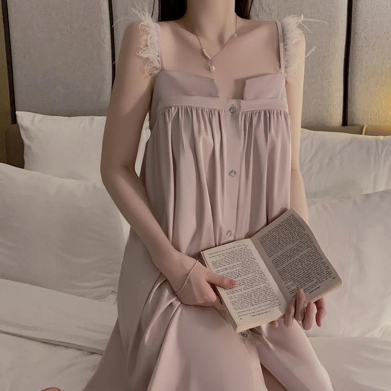 Женская ночная рубашка с перьевыми бретелями, ночная рубашка из атласа Ice Silk, удобная и нескользящая, женская ночная рубашка
