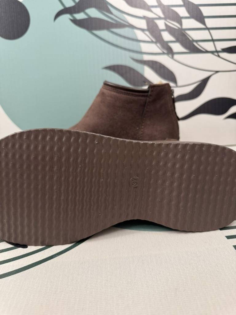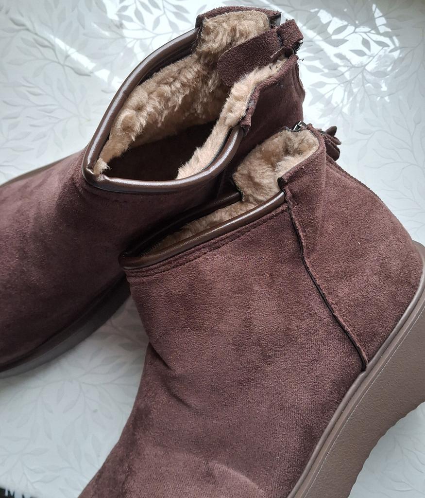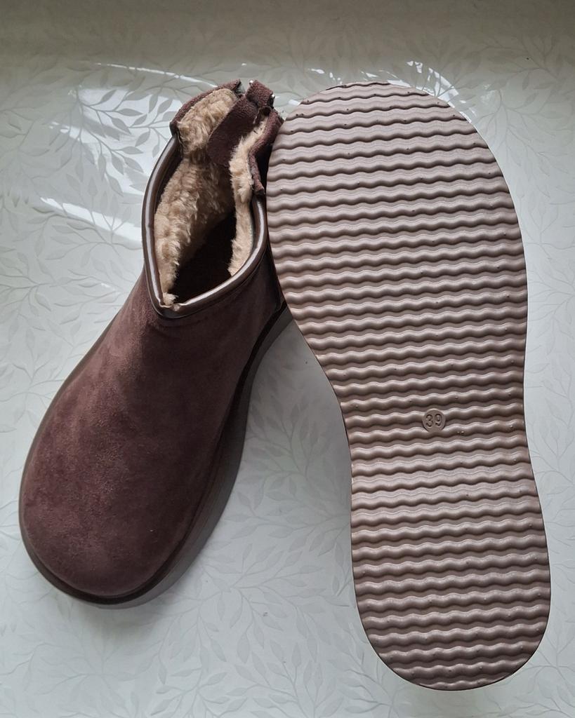 Меховые ботинки из искусственной замши. Молния на пятке удобна для быстрого надевания и снятия. Окантовка из кожзаменителя придает прочность и стильный вид. Подошва высокая, можно назвать ее платформой, что обеспечивает дополнительный комфорт и защиту от холода и влаги (для Петербурга очень актуально). Внутри мягкий и теплый мех, что отлично подходит для холодного времени года. Подошва плоская, поэтому для удобства нужно использовать дополнительный подпяточник. Родная стелька приклеена, не вытаскивается и не подлежит стирке, что может вызывать дискомфорт. Посадка точная на стопу 24,5 см, но без запаса, сидит очень плотно. Поэтому для комфорта лучше брать размер больше. Из-за невынимаемой стельки сложно объективно оценить соответствие размера размерной таблице, возможно внутренние размеры меньше заявленных. Несмотря на небольшие недостатки, ботинки оцениваю на 5 звезд за удобство, тепло и стильный внешний вид. Если вы выбираете размер, учитывайте необходимость возможной замены стельки и берите чуть больше для комфорта. При возможности я бы заменила 39 размер на 40 для моей стопы 24.5 см. ⭐ Продавец упаковал товар в почтовый конверт с пупыркой внутри. Есть пыльники для каждого ботинка отдельно. ⭐ Трек номер отслеживался до почтового отделения. ⭐ В приложении пришло уведомление о готовности к выдаче заказа. ⭐ Доставка в Петербург заняла 22 дня.