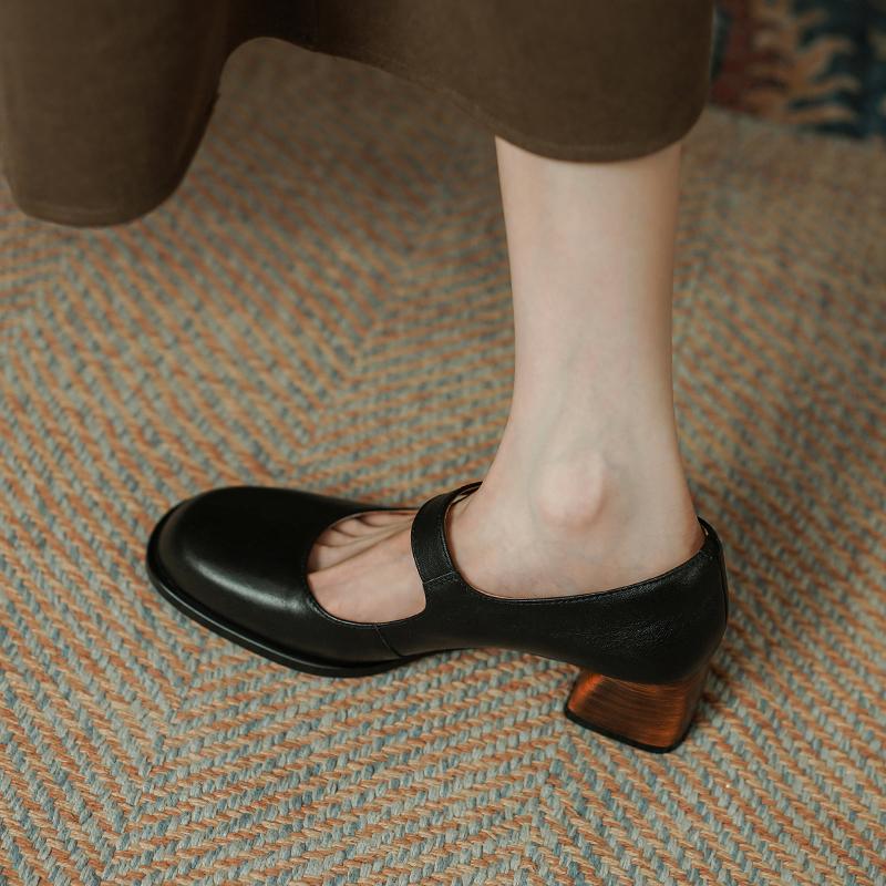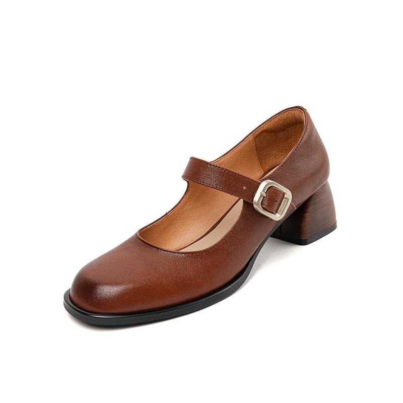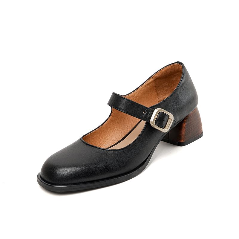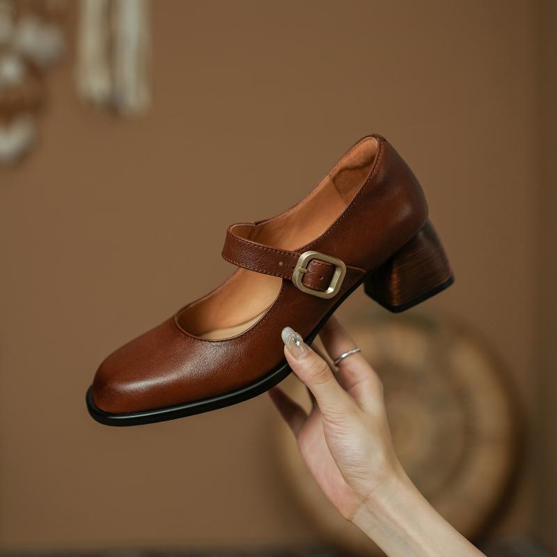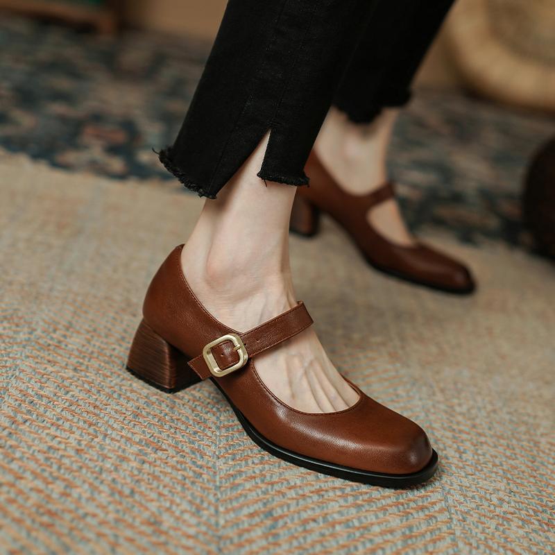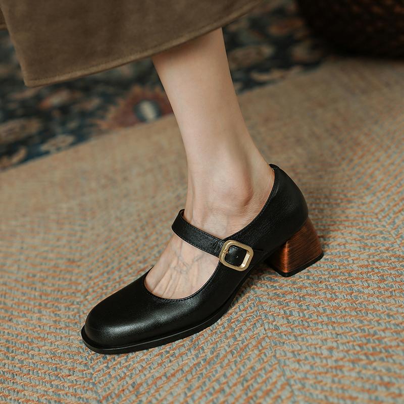 Качественные женские туфли-лодочки из натуральной кожи 2024 года, весна-лето, ретро-стиль, лаконичные туфли на толстом каблуке с пряжкой, женские повседневные туфли Мэри Джейн