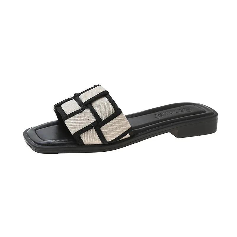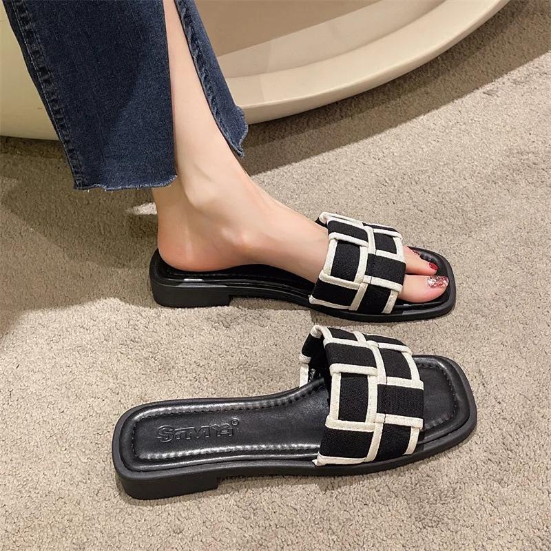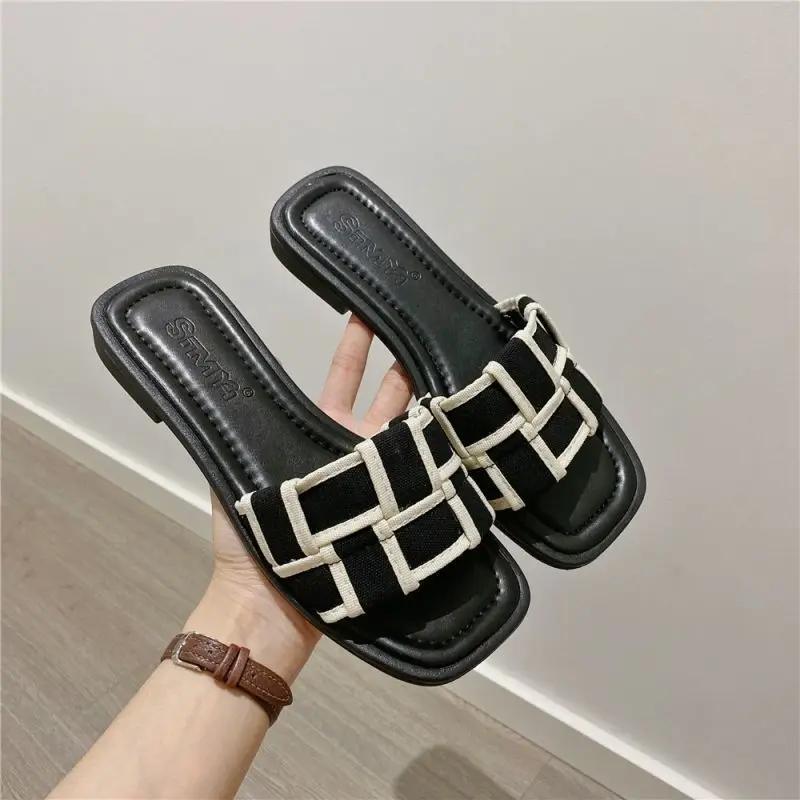 Тапочки в черно-белую клетку, женская одежда, лето 2024, новые шлепанцы, пляжные тапочки на плоской подошве, женская обувь