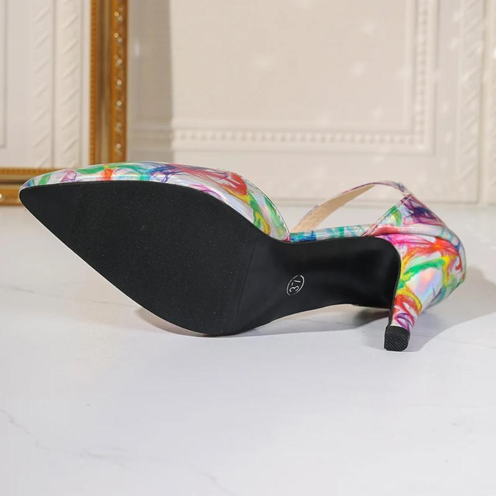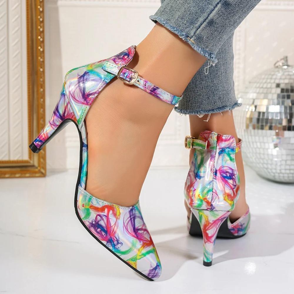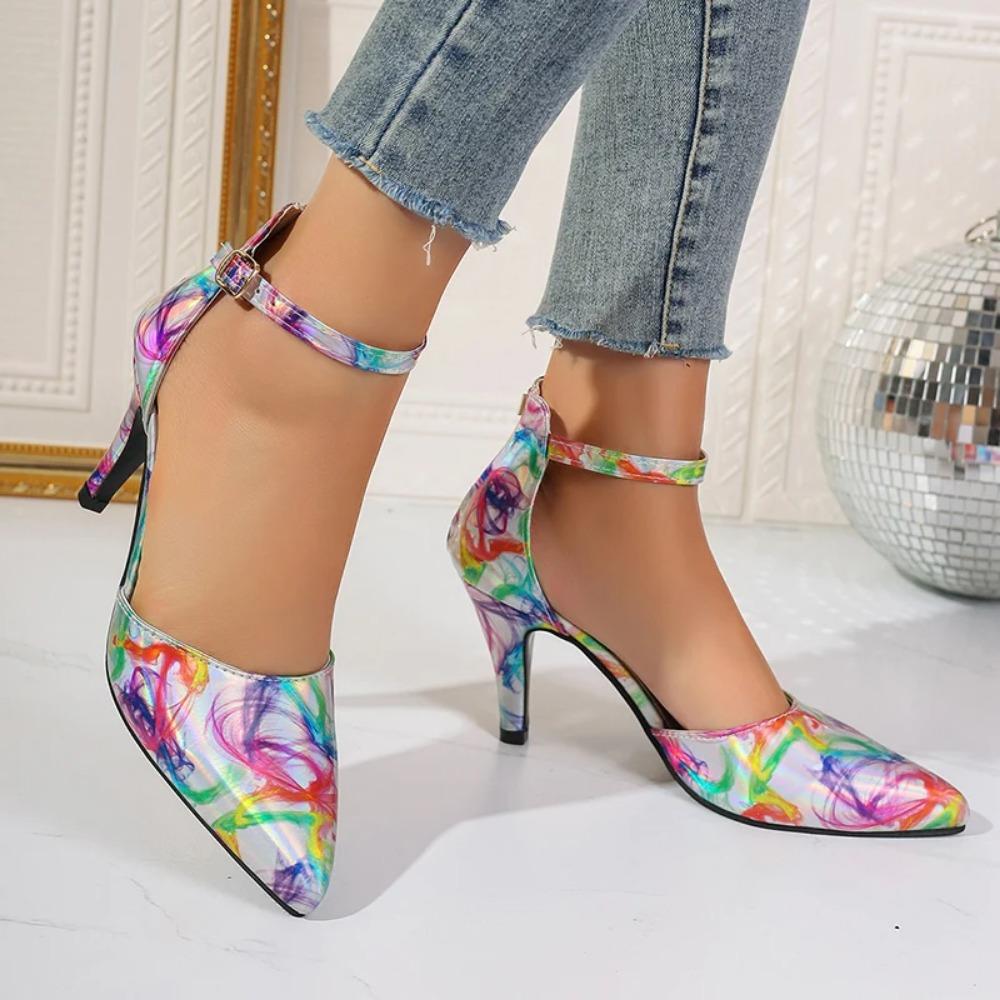 Женские босоножки 2024 года, летние туфли на среднем каблуке с острым носком, повседневные туфли на высоком каблуке с пряжками-иголками и цветовым сочетанием, модная женская обувь