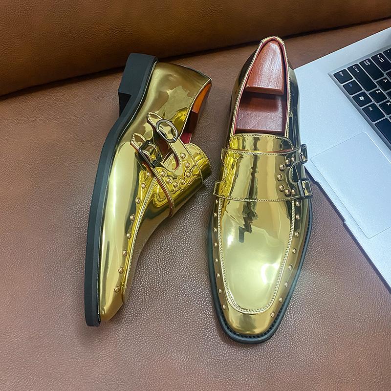 Новые Золотые Мужские Туфли Лоферы Квадратный Носок Ремешок с Пряжкой Весна Осень Ручная Работа Свадебная Обувь Размер 38-46