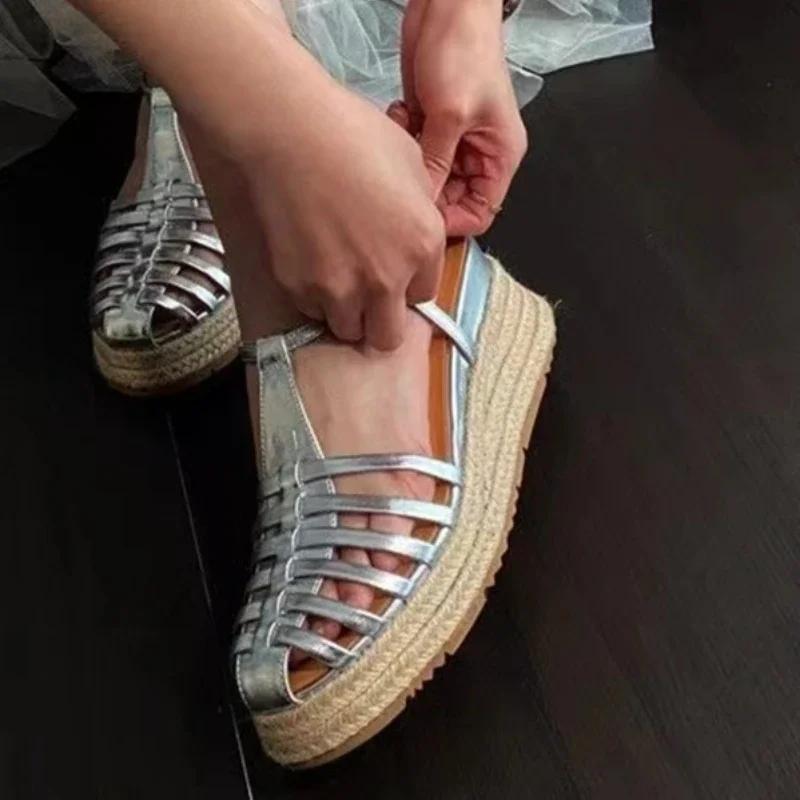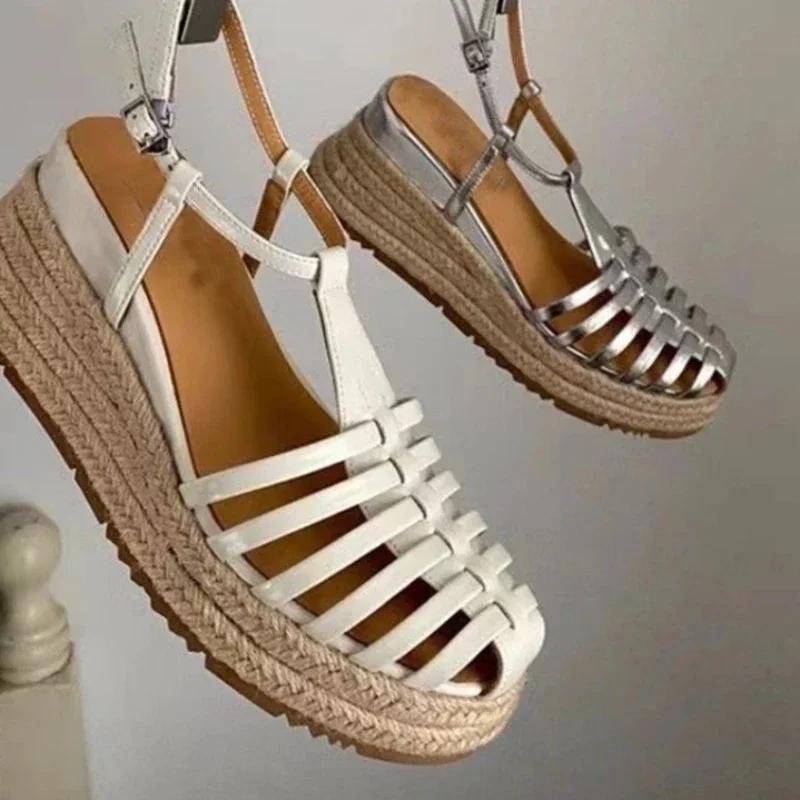 2024 Сандалии-гладиаторы на плоской подошве с вырезами для женщин, сандалии из пеньковой веревки с закрытым носком для женщин, летние повседневные пляжные сандалии для женщин