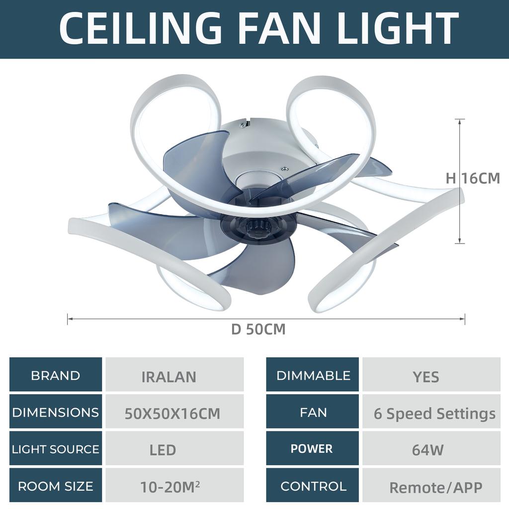 IRALAN Современный потолочный вентилятор с подсветкой для дома и декора, интеллектуальное дистанционное управление, большой светодиодный вентилятор для дома 50 см