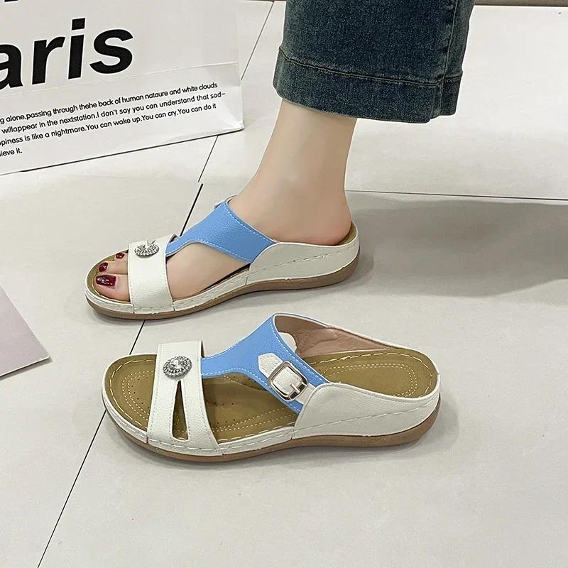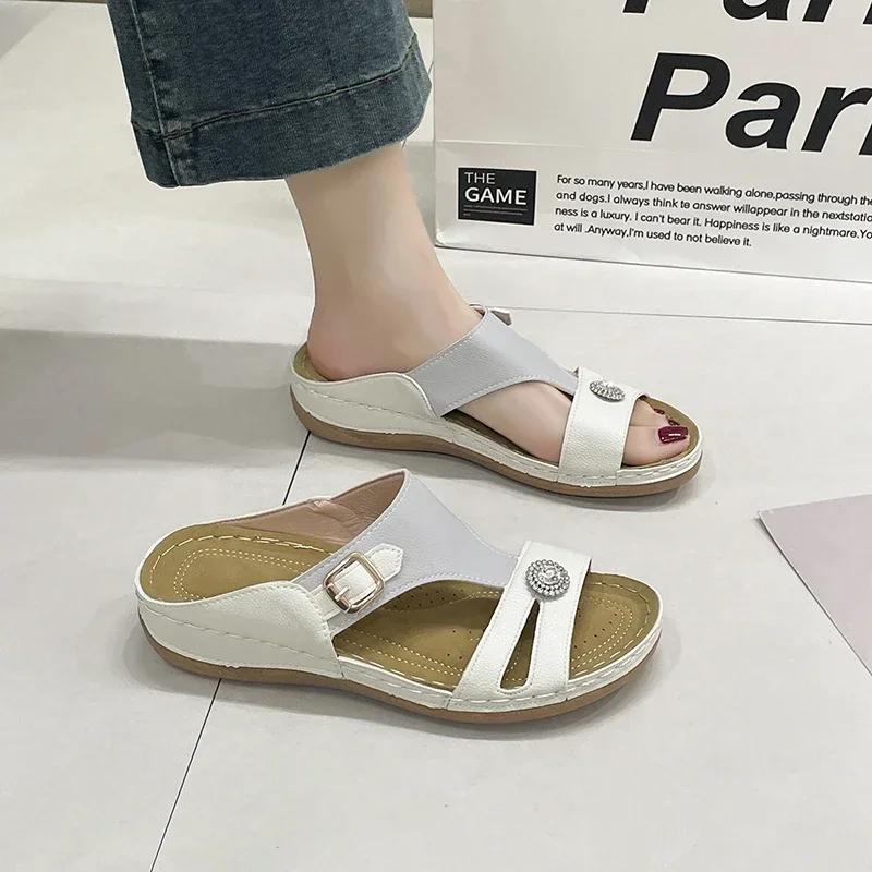 Летние женские тапочки на танкетке, новые ретро-ботинки с открытым носком и поддержкой свода стопы, ортопедические женские сандалии на платформе, повседневная пляжная обувь для отдыха на природе