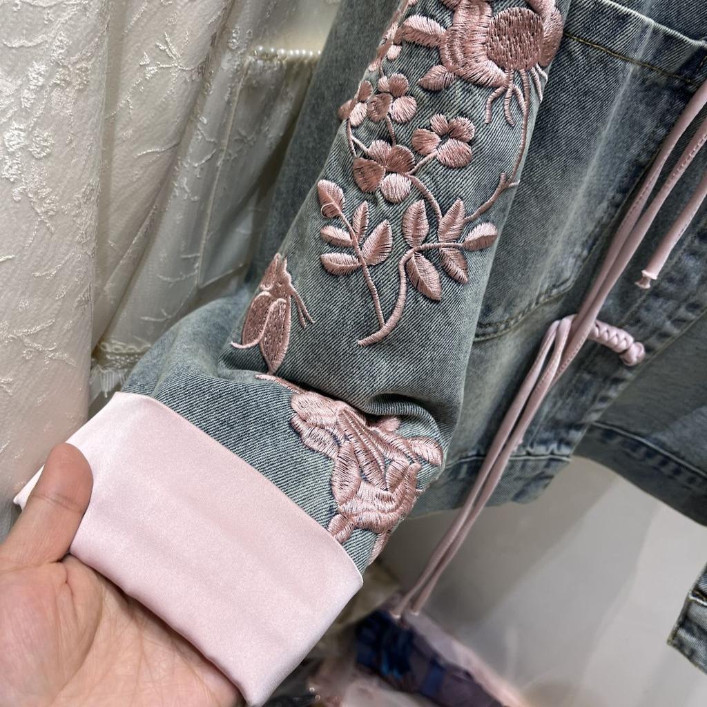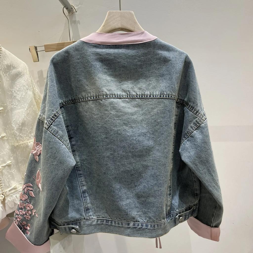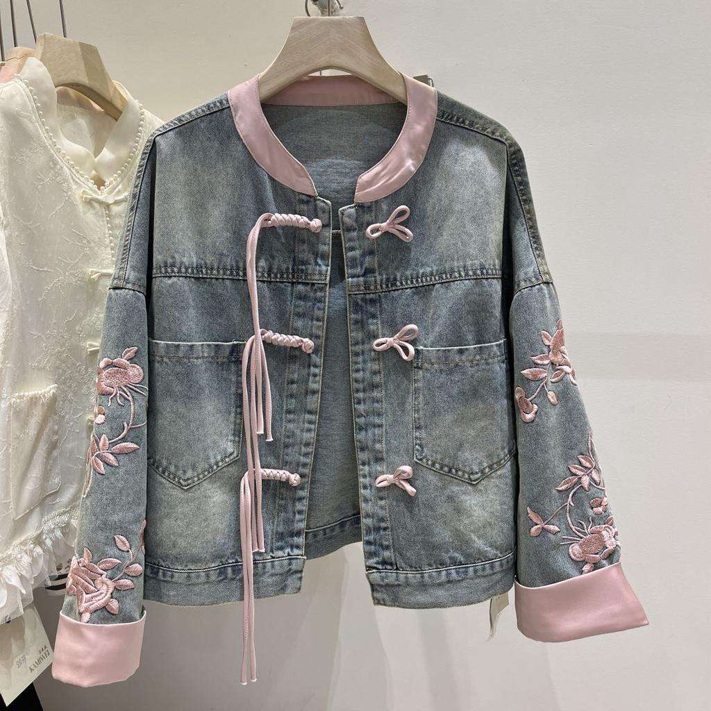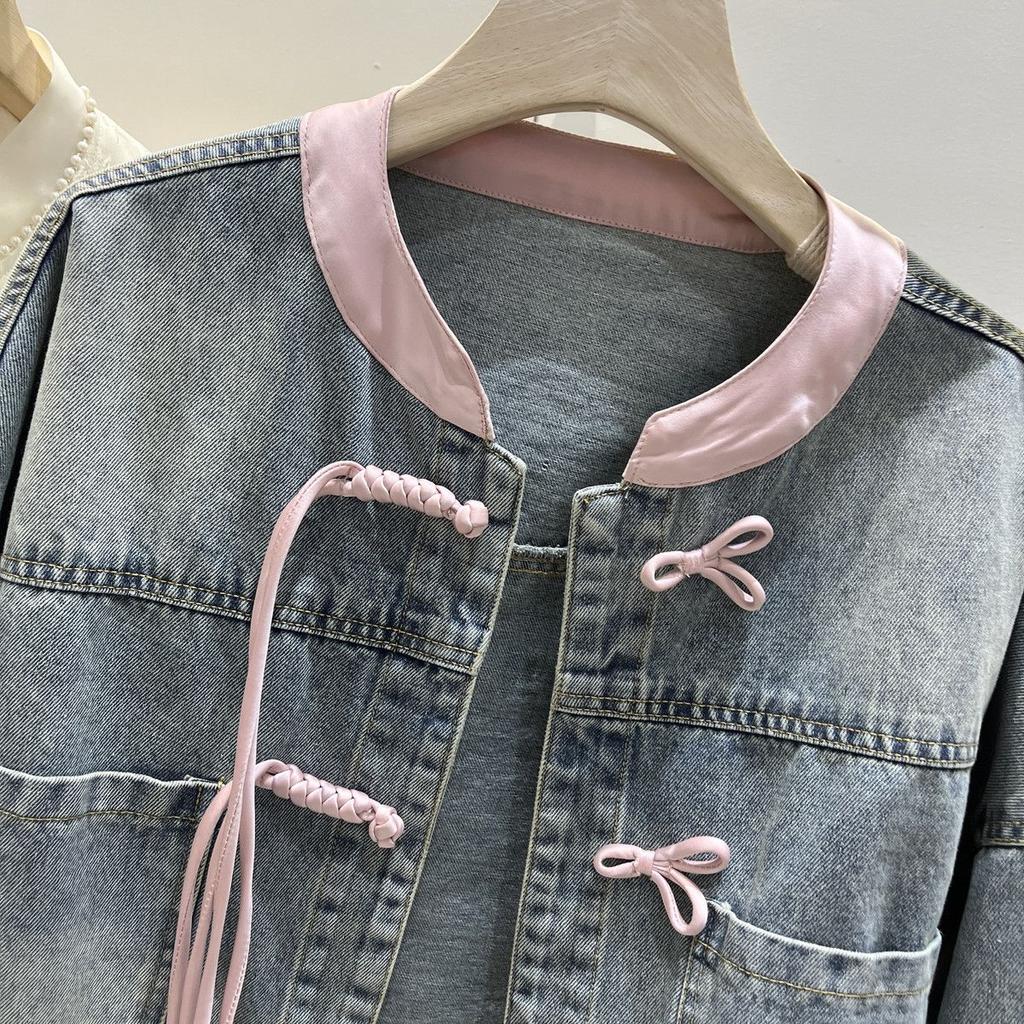 Короткое джинсовое пальто с пряжкой, женское джинсовое пальто в китайском стиле, топ-бомбер с воротником-стойкой, верхняя одежда, модная уличная джинсовая куртка, женская