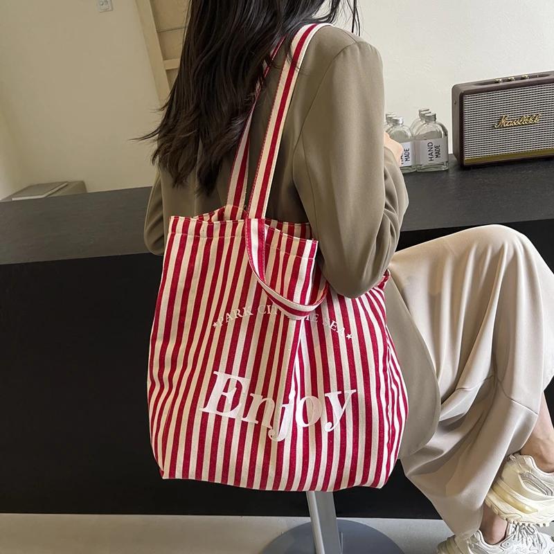 Полосатая холщовая сумка через плечо с буквенным дизайном, вместительная, повседневная, минималистичная и универсальная