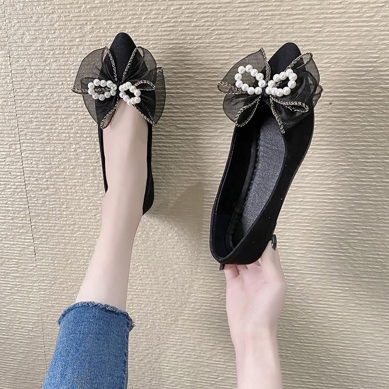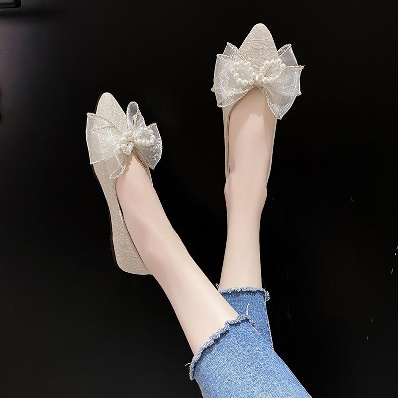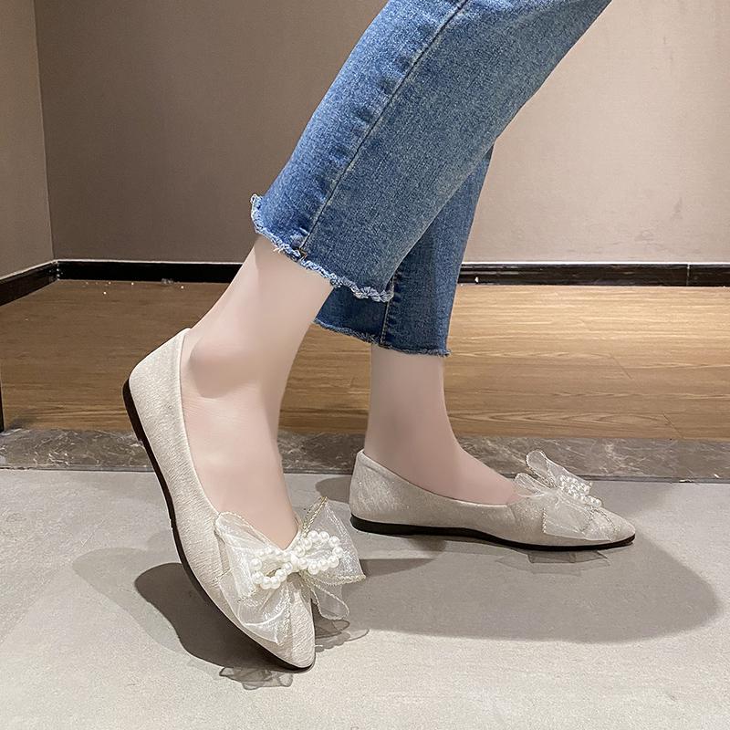 Женские балетки с жемчужным бантом, с острым носком, женские модные мягкие кружевные элегантные лоферы для взрослых, женские балетки Muj, женские балетки 2024