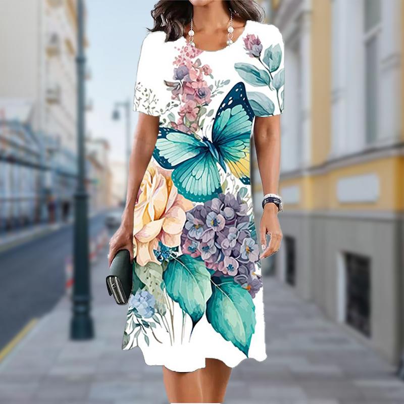 Женское повседневное платье, летнее зеленое платье с принтом бабочек для женщин, платье с коротким рукавом и круглым вырезом, размер плюс
