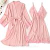 Черный кружевной халат из 2 предметов, ночная рубашка, комплект, весна-лето, женская ночная рубашка, сексуальный банный халат, нижнее белье, свободная атласная домашняя одежда
