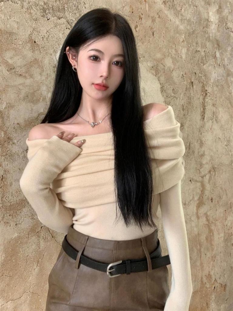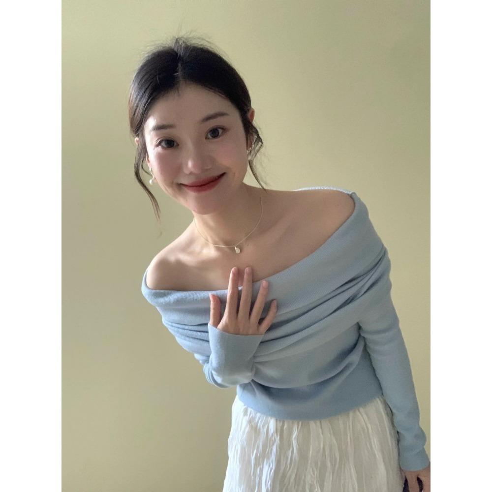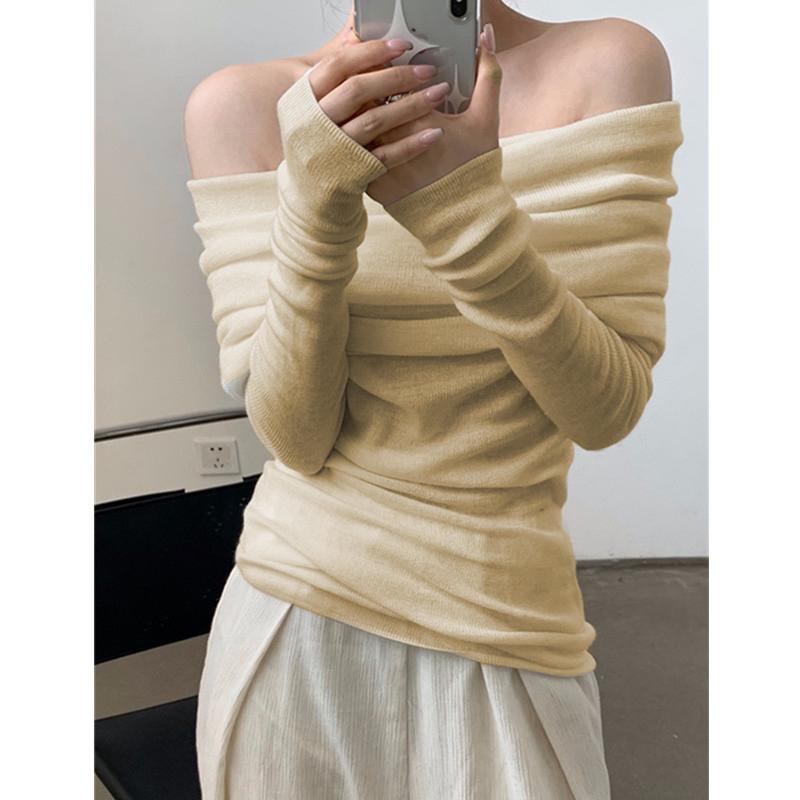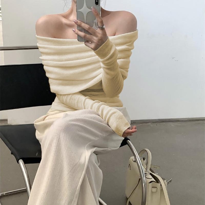 Женский свитер с вырезом-лодочкой, длинный рукав, трикотаж, однотонный, с открытыми плечами, осенние тонкие пуловеры, офисные женские элегантные топы