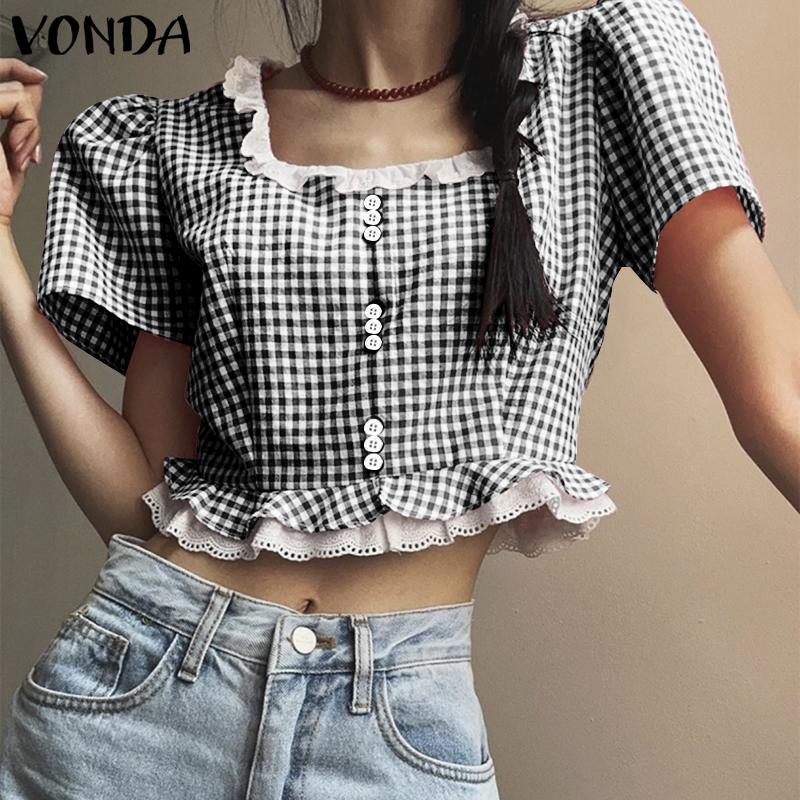 VONDA Женские летние кружевные блузки с квадратным вырезом в клетку и короткими рукавами — купить товар онлайн с бесплатной доставкой по всему миру!