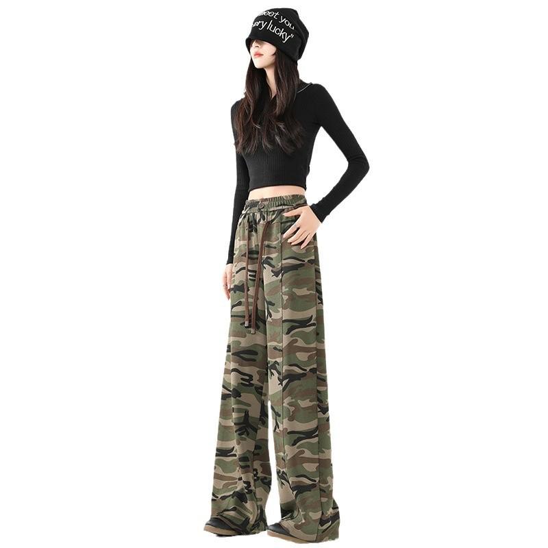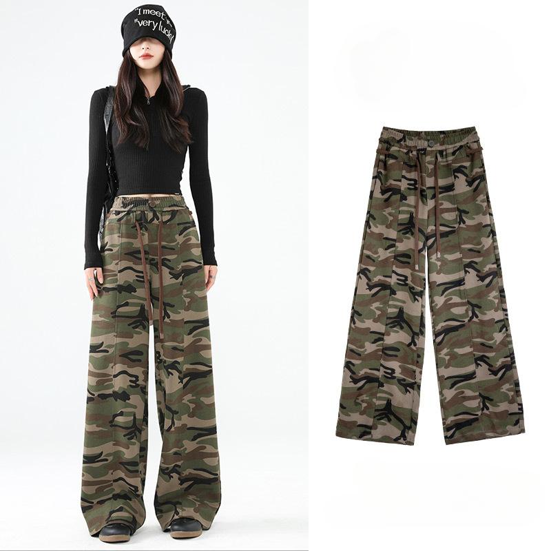 Камуфляжные рабочие брюки с широкими штанинами для женщин, модные свободные брюки прямого покроя с высокой талией в стиле ретро