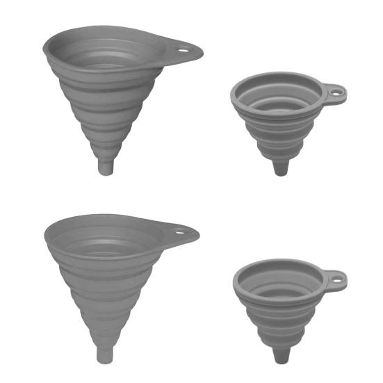 Универсальные варианты размеров: В этот набор входят четыре серые силиконовые воронки разных размеров, подходящие для разных нужд.. Эти складные воронки из силикона, от больших до маленьких, являются незаменимыми кухонными принадлежностями, особенно для занятых мам, ищущих практичности и эффективности в своих кулинарных начинаниях.