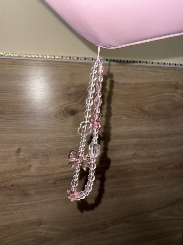 браслетик афигенный я конечно думала, что в нем больше белого цвета, но и прозрачный он оказался красивым он довольно длинный и круто смотрится на телефоне