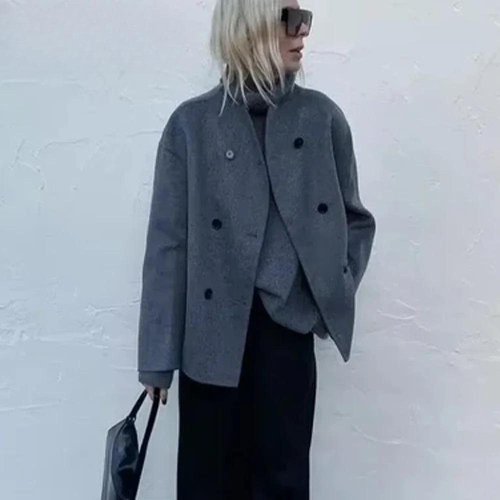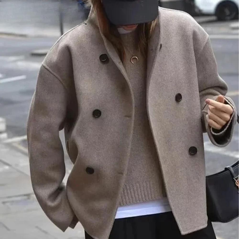 Осень-зима Женское повседневное однотонное шерстяное пальто Модная офисная женская свободная двубортная водолазка Демисезонная куртка