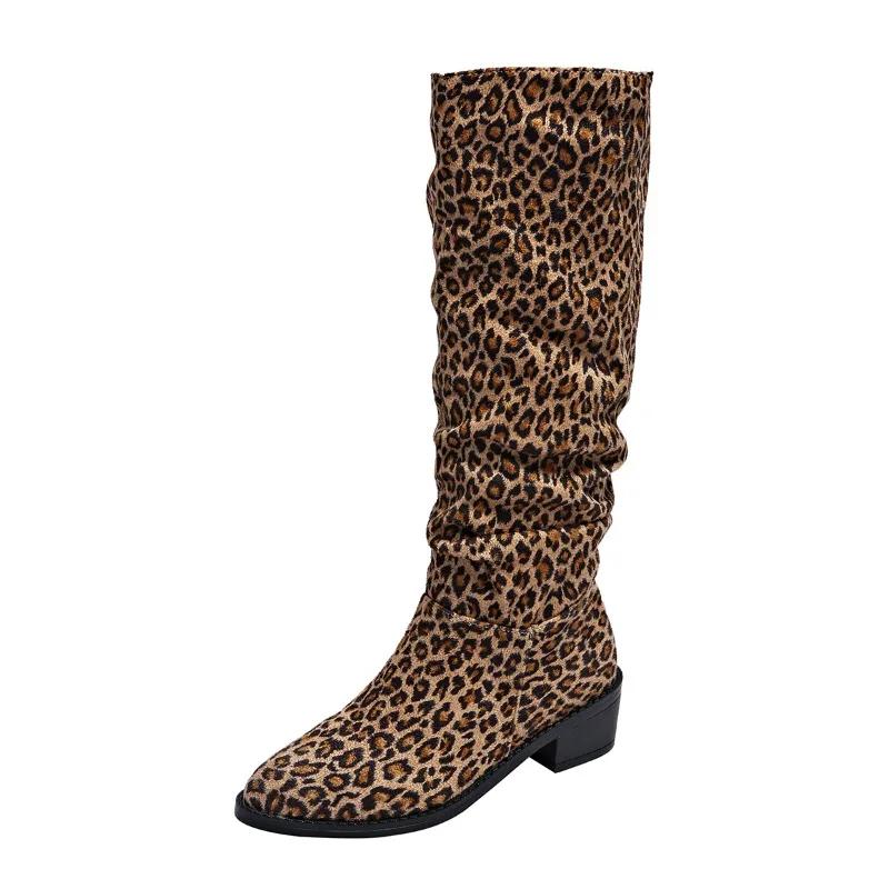 2024 Женская обувь Высокие женские сапоги без застежек Современные сапоги Женские леопардовые плиссированные заостренные носки Средний каблук Туфли больших размеров для женщин