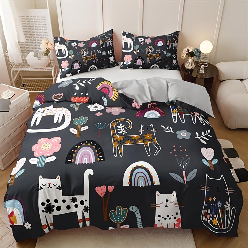 Комплект постельного белья с принтом кошек и цветов - Включает 1 пододеяльник и 2 наволочки, дышащий полиэстер, машинная стирка - Идеально — купить товар онлайн с бесплатной доставкой по всему миру!