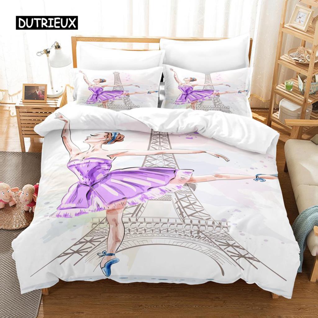 Комплект постельного белья для девочек-балетниц, фиолетовый комплект постельного белья с изображением танцовщицы Эйфелевой башни для детей, размер King Size, мягкий полиэстеровый пододеяльник