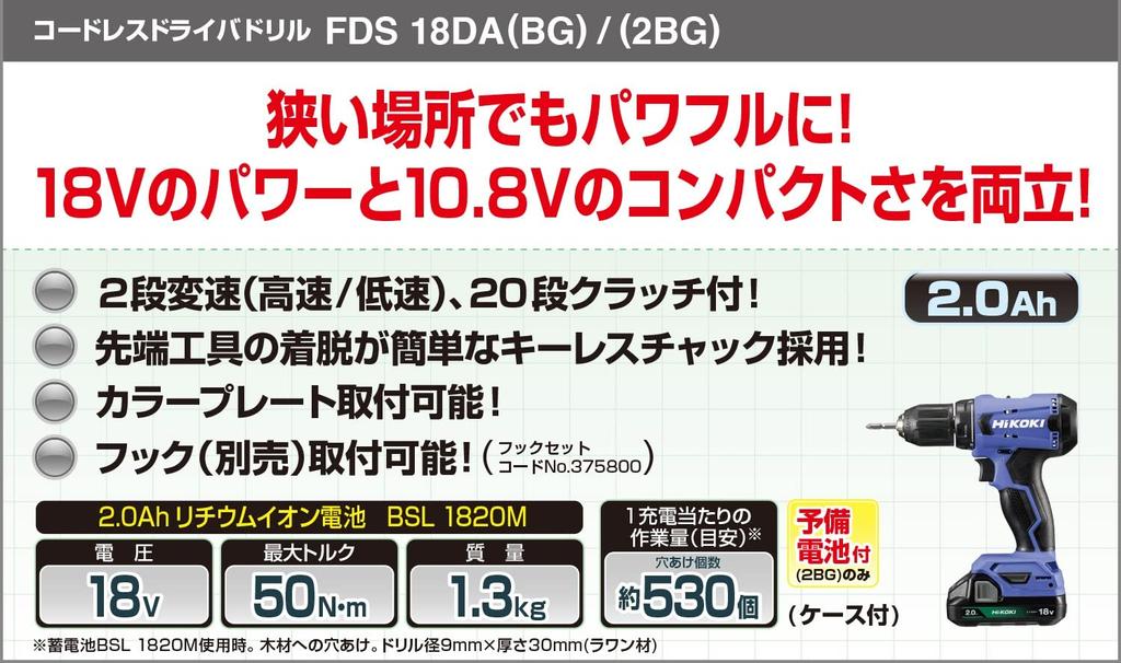 HiKOKI 18 В аккумуляторный шуруповерт патрон для дрели 20-ступенчатая муфта аккумулятор x 2 зарядное устройство с кейсом 2.0-13 мм 2.0 Ач FDS18DA(2БГ)