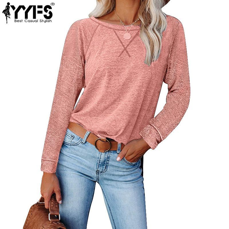 YYFS Женские модные повседневные весенне-осенние однотонные блузки и рубашки с круглым вырезом с длинными рукавами и принтом