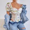 Новое боди из кружевной сетки с принтом и стальным кольцом с пузырьковыми рукавами и принтом.
