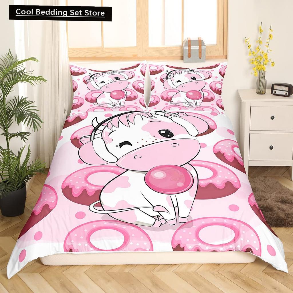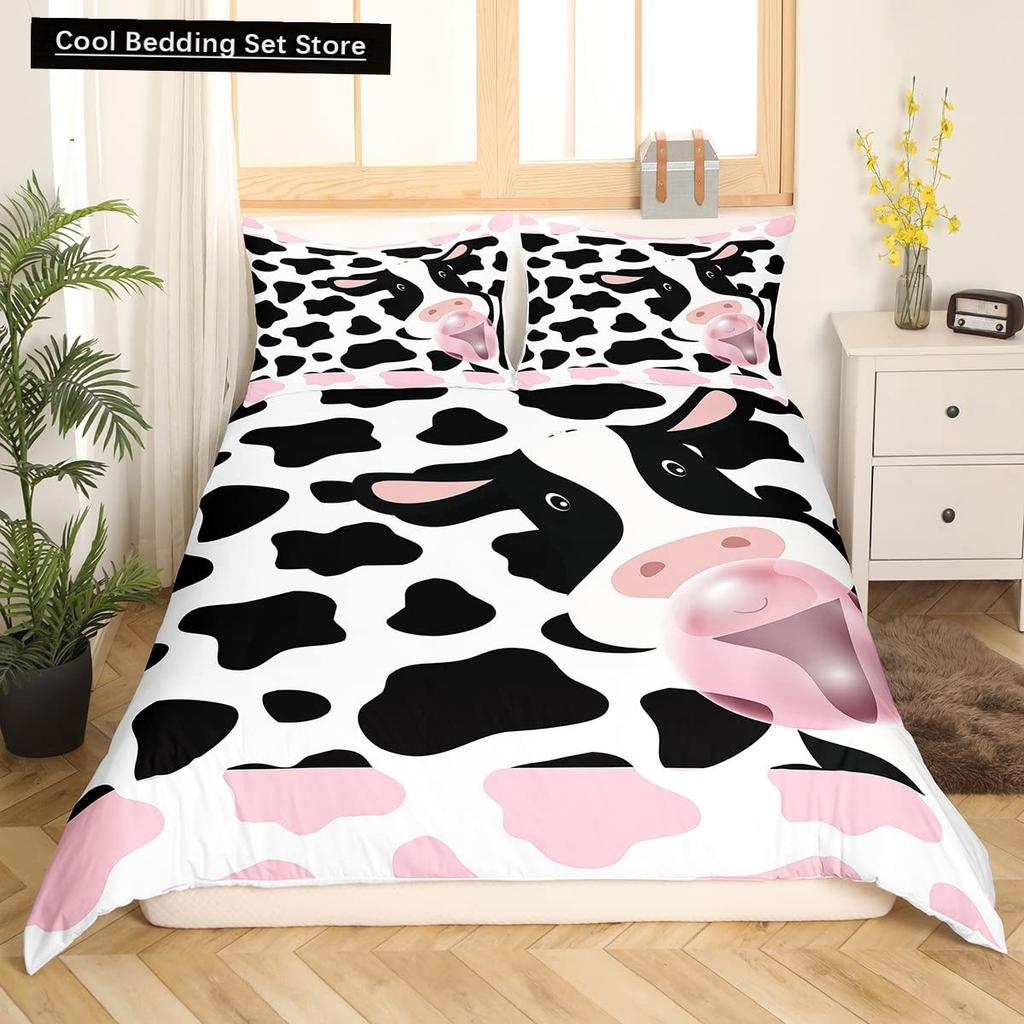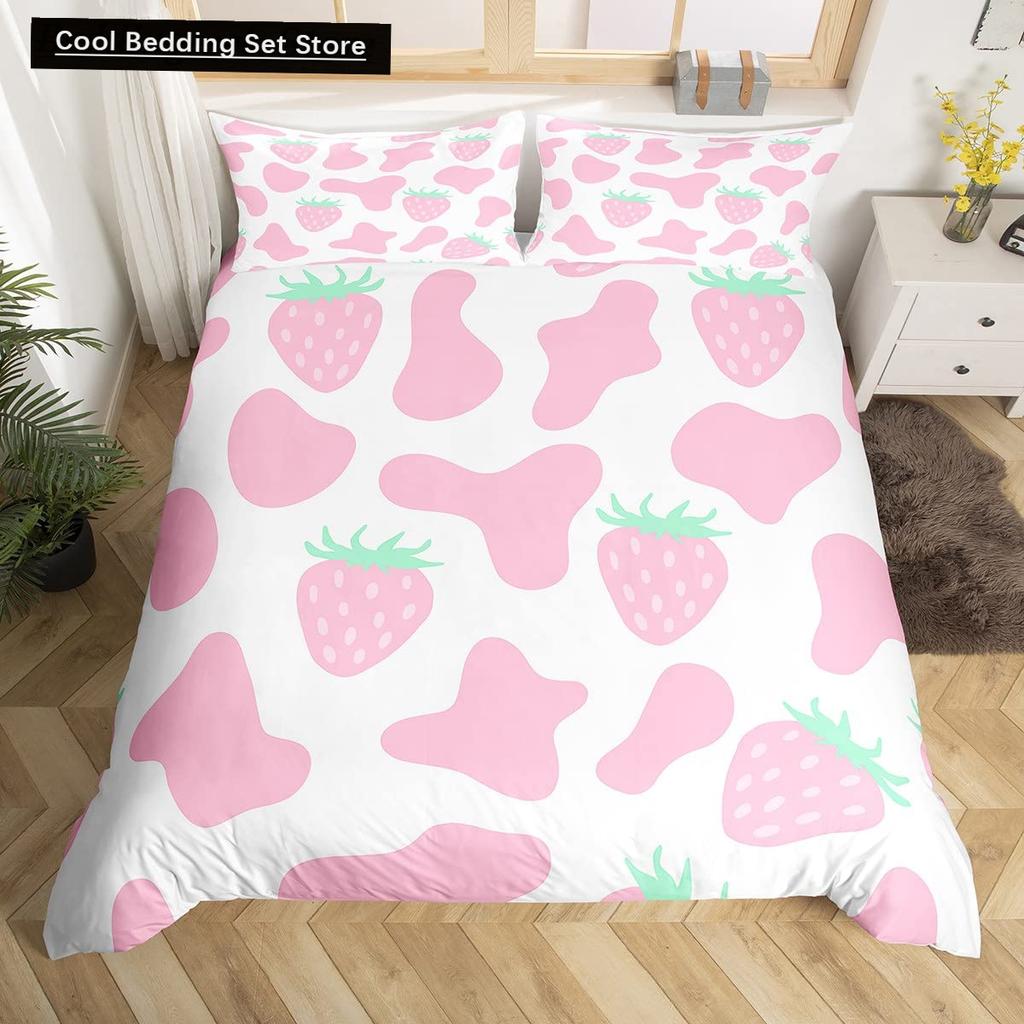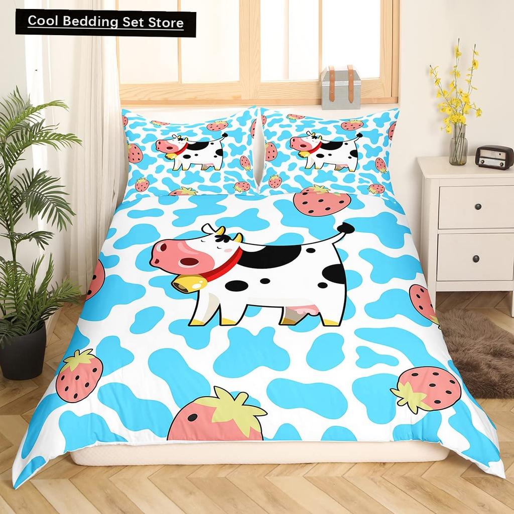 Пододеяльник размера King/Queen с молочной коровой, розово-белый, мультяшный животный принт, клубничный комплект постельного белья для детей, мальчиков, девочек, с принтом коровы, мягкий пододеяльник