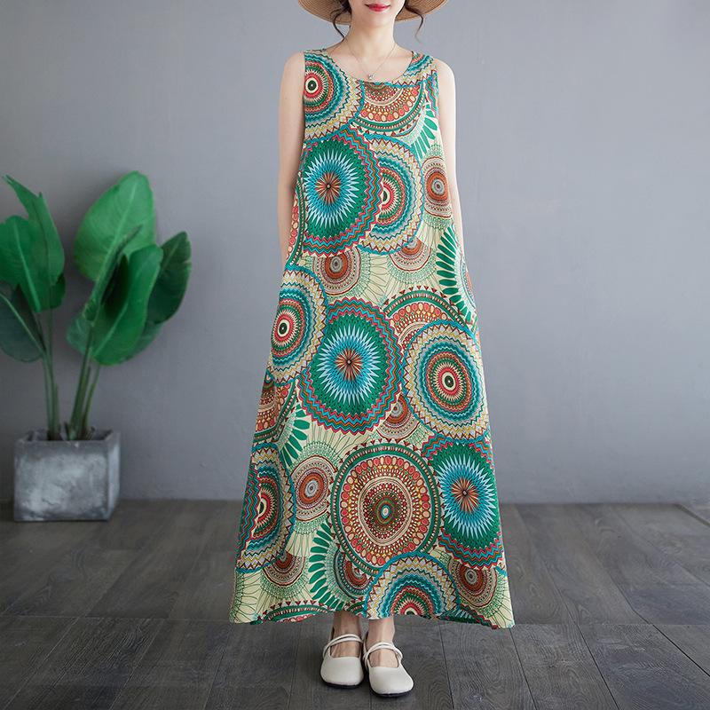 Летнее ретро свободное хлопковое льняное платье с круглым вырезом без рукавов жилет средней длины для женщин повседневные платья — купить товар онлайн с бесплатной доставкой по всему миру!