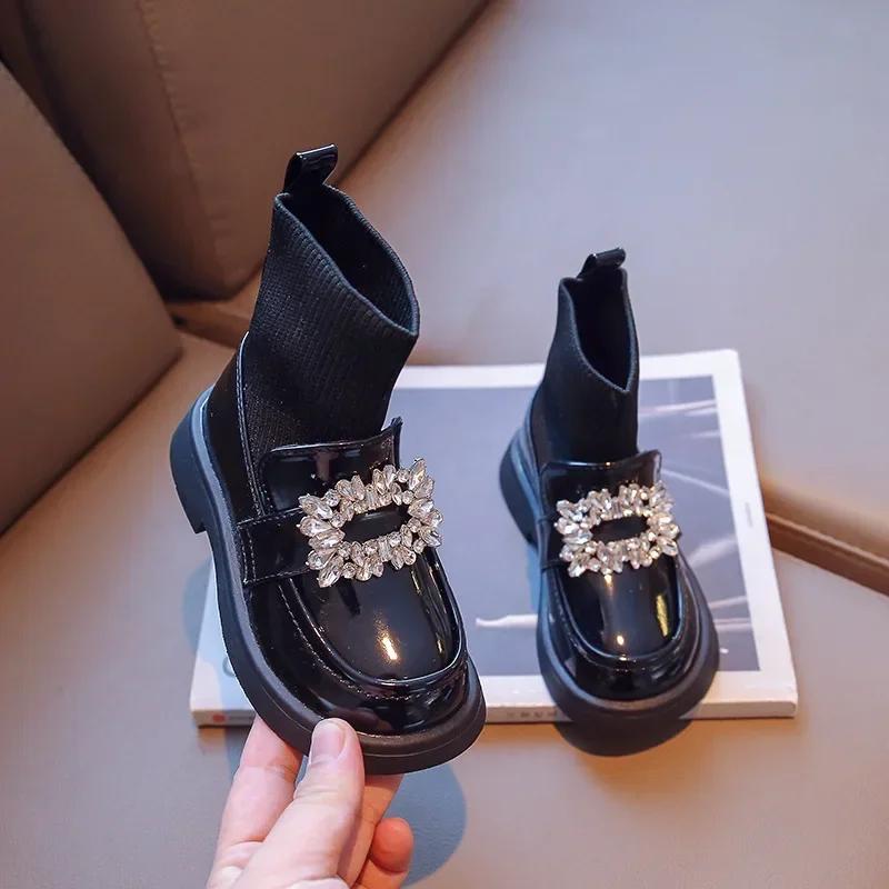 Ботинки принцессы со стразами для девочек, квадратная пряжка, детские милые носки, детские кожаные ботинки с мягкой подошвой, нескользящие, новинка 2024 года