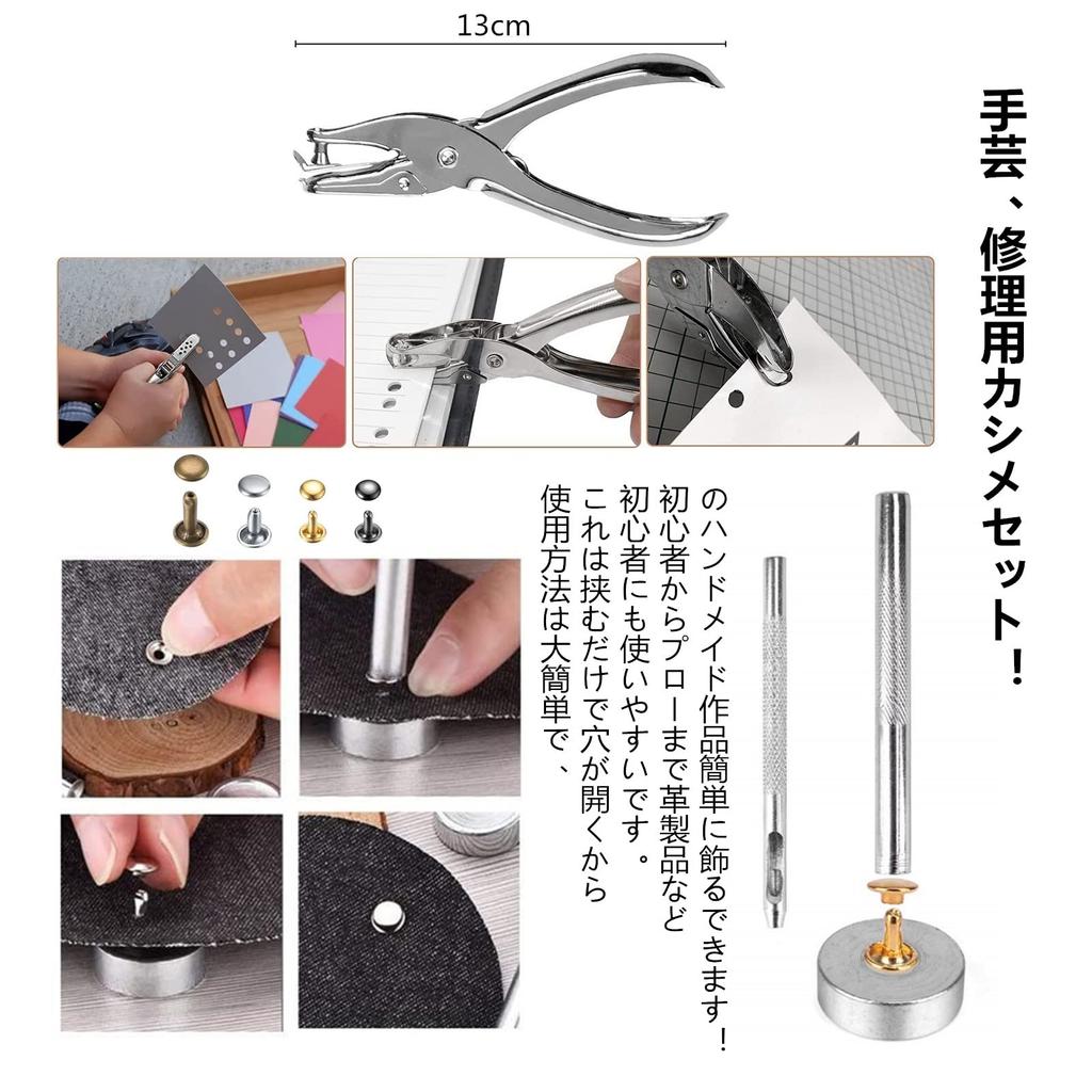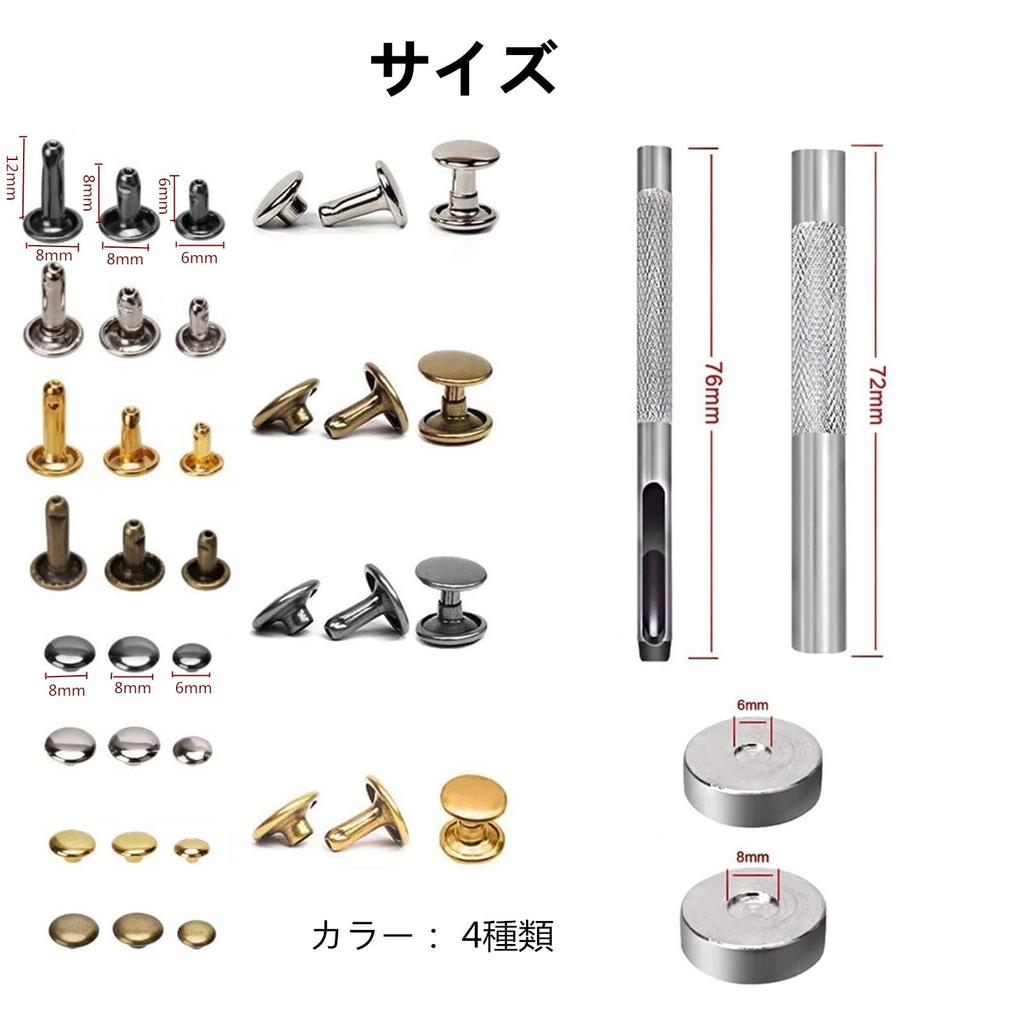 [Содержимое упаковки] Набор для обжима *240 пар, плоскогубцы для пробивания отверстий *1, клюшка для бит *2, подставка для пробивания отверстий *1, футляр для хранения *1. 4 цвета: золото, серебро, бронзовый цвет, бронза. 3 размера: (6 * 6 мм / 8 * 8 мм / 8 * 12 мм) 20 комплектов каждый. У нас есть широкий выбор аксессуаров, благодаря которым вы сможете изготовить множество красивых изделий из кожи.