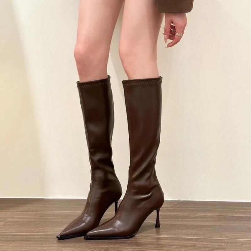 2024 Высококачественная женская обувь с застежкой-молнией сзади, женские сапоги, модные однотонные современные сапоги, женские сексуальные сапоги с острым носком до колена Zapatos