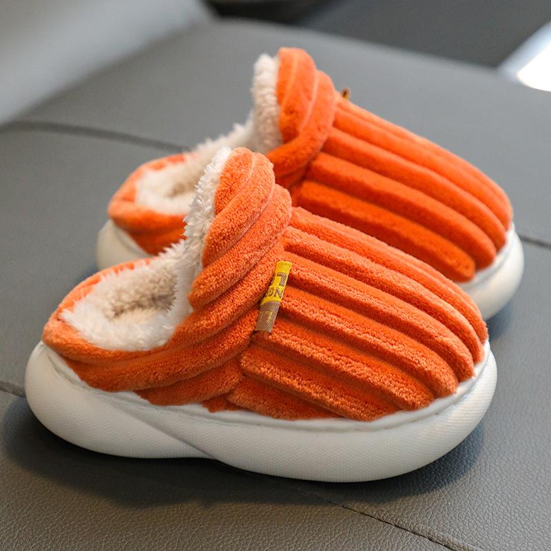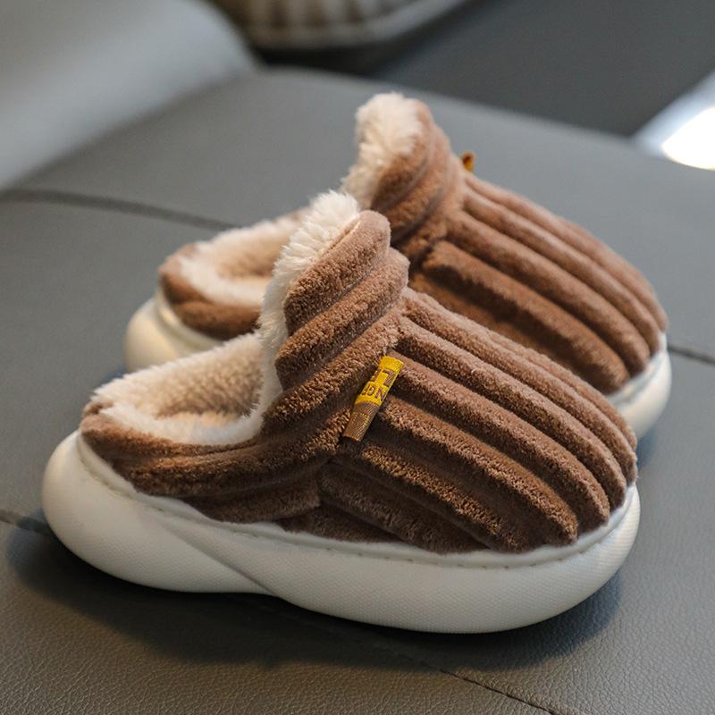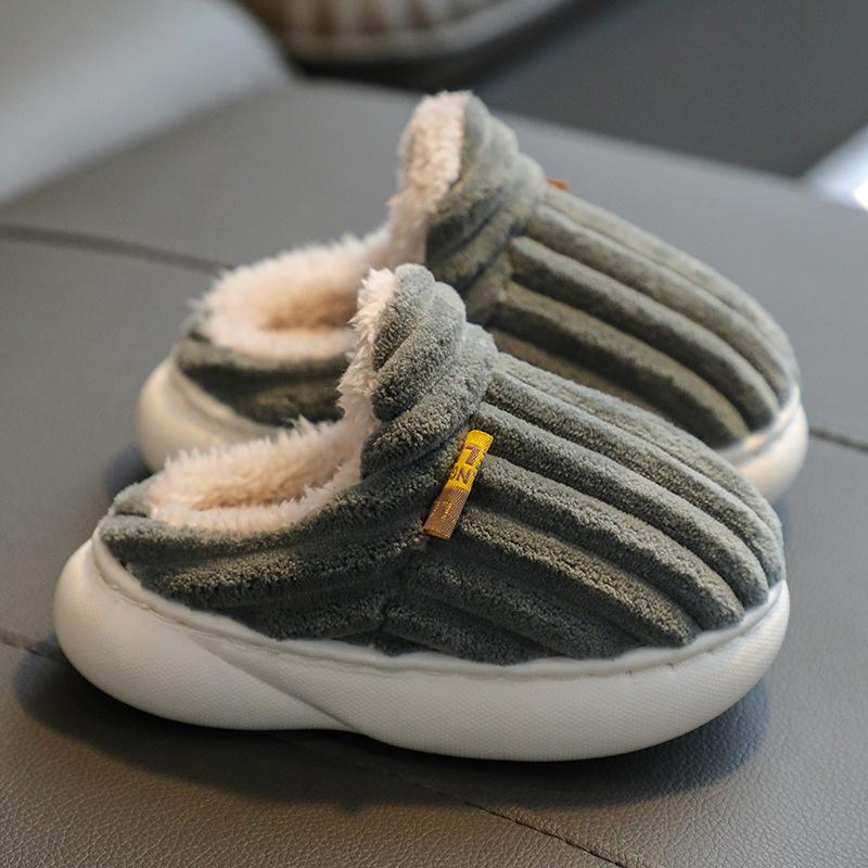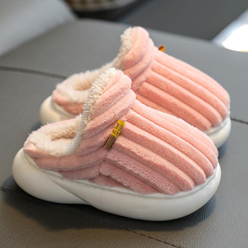 Детские хлопковые тапочки в четкую полоску, плюшевые тапочки, нескользящая мягкая подошва, для мальчиков и девочек, теплые высокие домашние тапочки с обхватом пятки