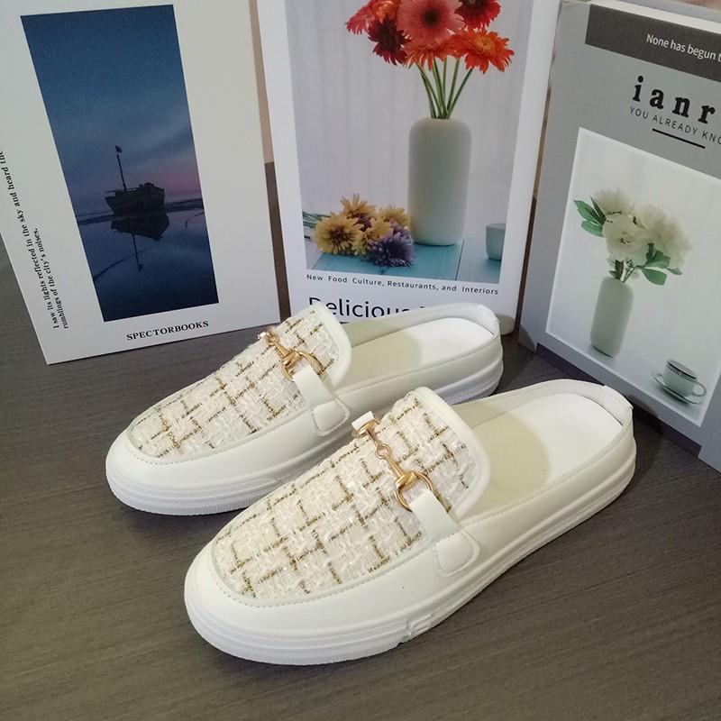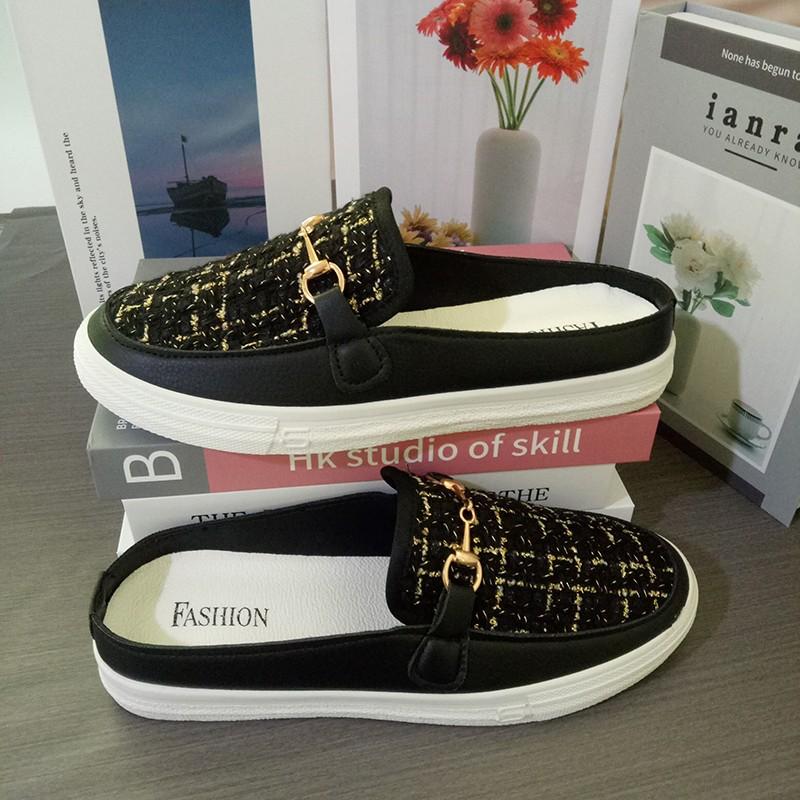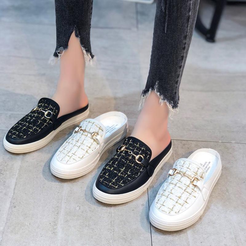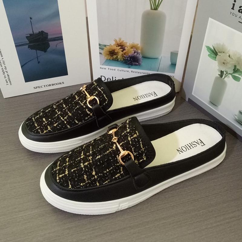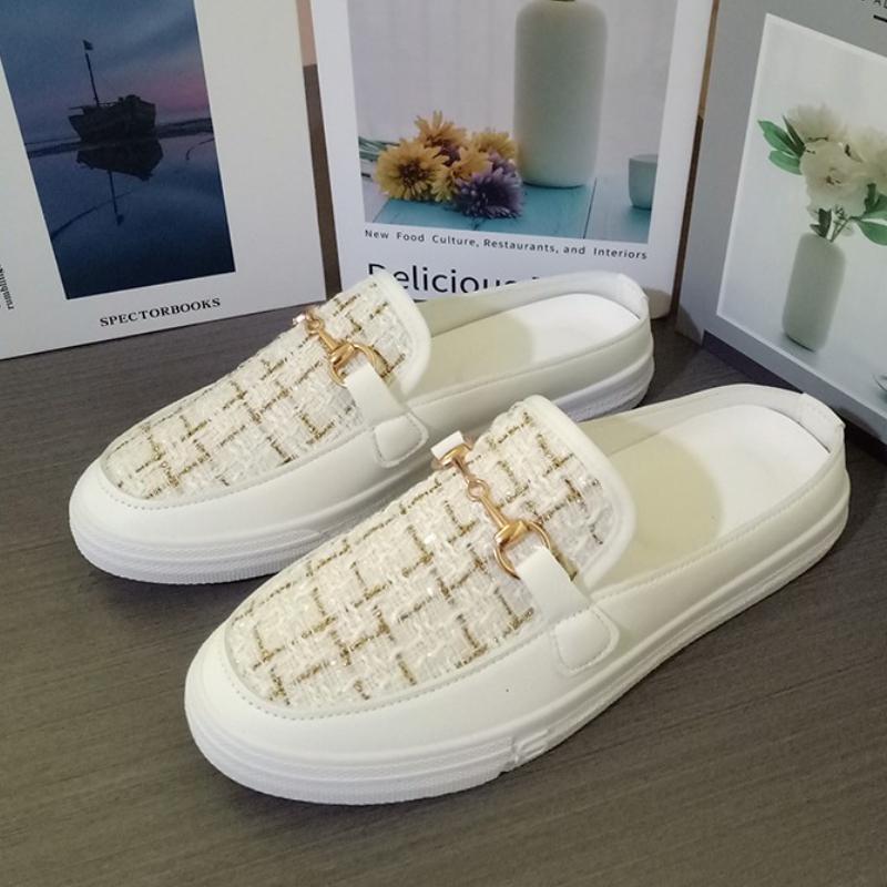 Женская обувь 2024 года, женские тапочки с закрытым носком, осенние, дышащие, с металлическим украшением, разноцветные, на плоской подошве, повседневные, удобные тапочки