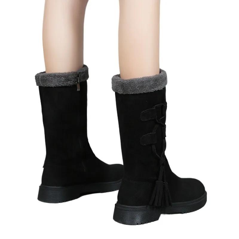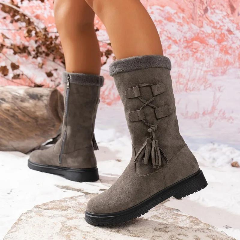 Обувь женская 2024 года, женские сапоги до середины икры, теплые современные сапоги, женские, с бахромой, с круглым носком, на низком каблуке, с боковой молнией, большие размеры, женская обувь