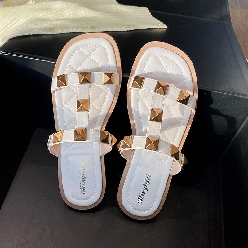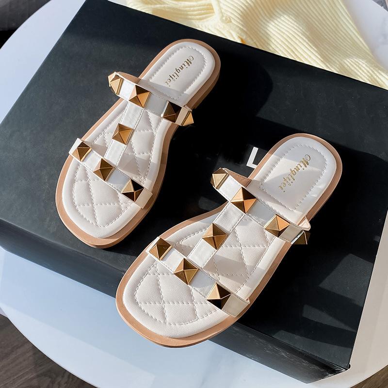 Европейская летняя обувь для женщин, тапочки с заклепками, повседневные сандалии для девочек, уличная мода, плоская обувь