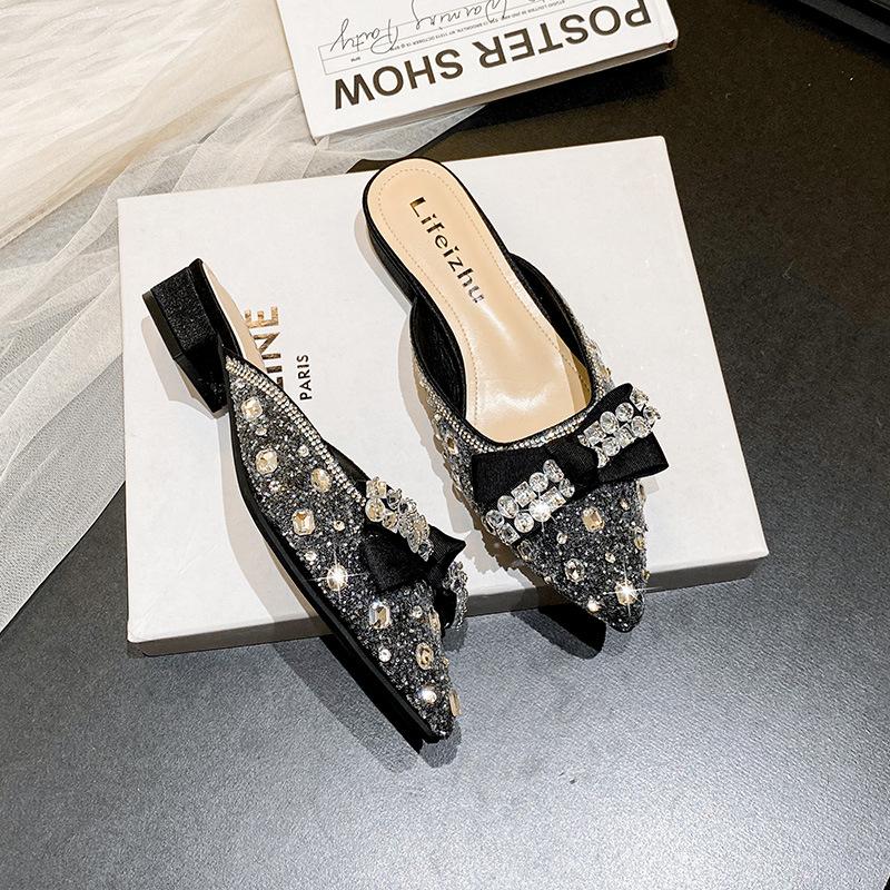2024 Летняя новая обувь для женщин, тапочки для девочек, хрустальные банты, уличные блестящие повседневные сандалии для девочек, туфли на каблуках, мюли