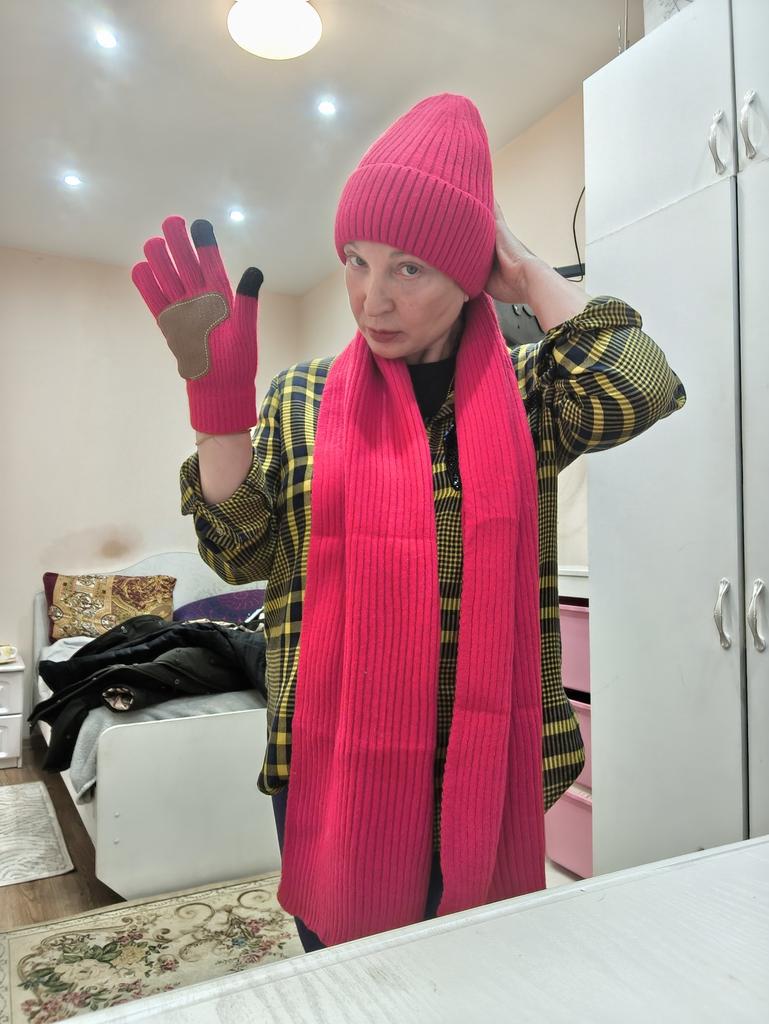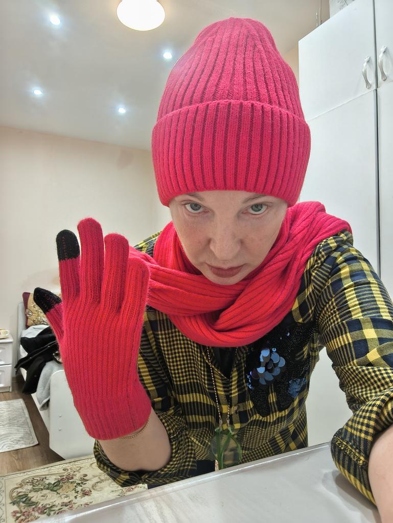 Все супер, качество, как сидит, цвет, все как на фото. Шапка двойная утеплённая, шарф широкий, перчатки как раз. Покупкой я довольна.